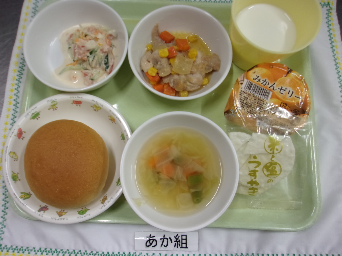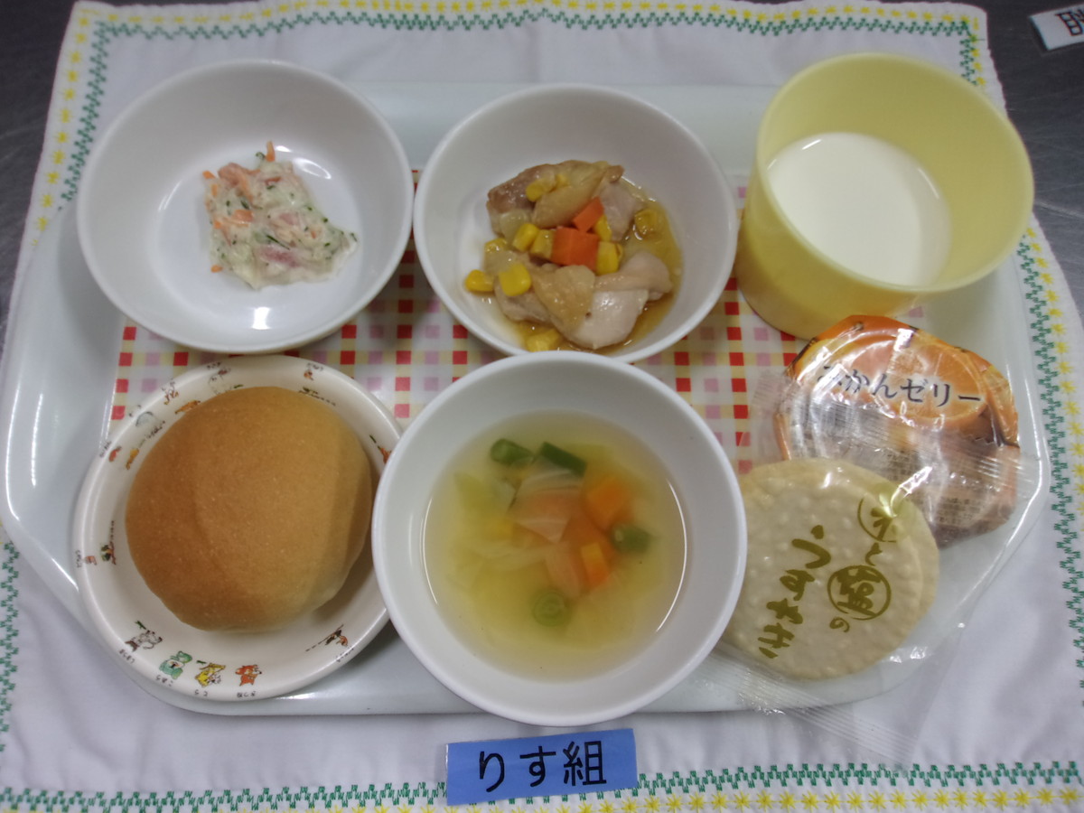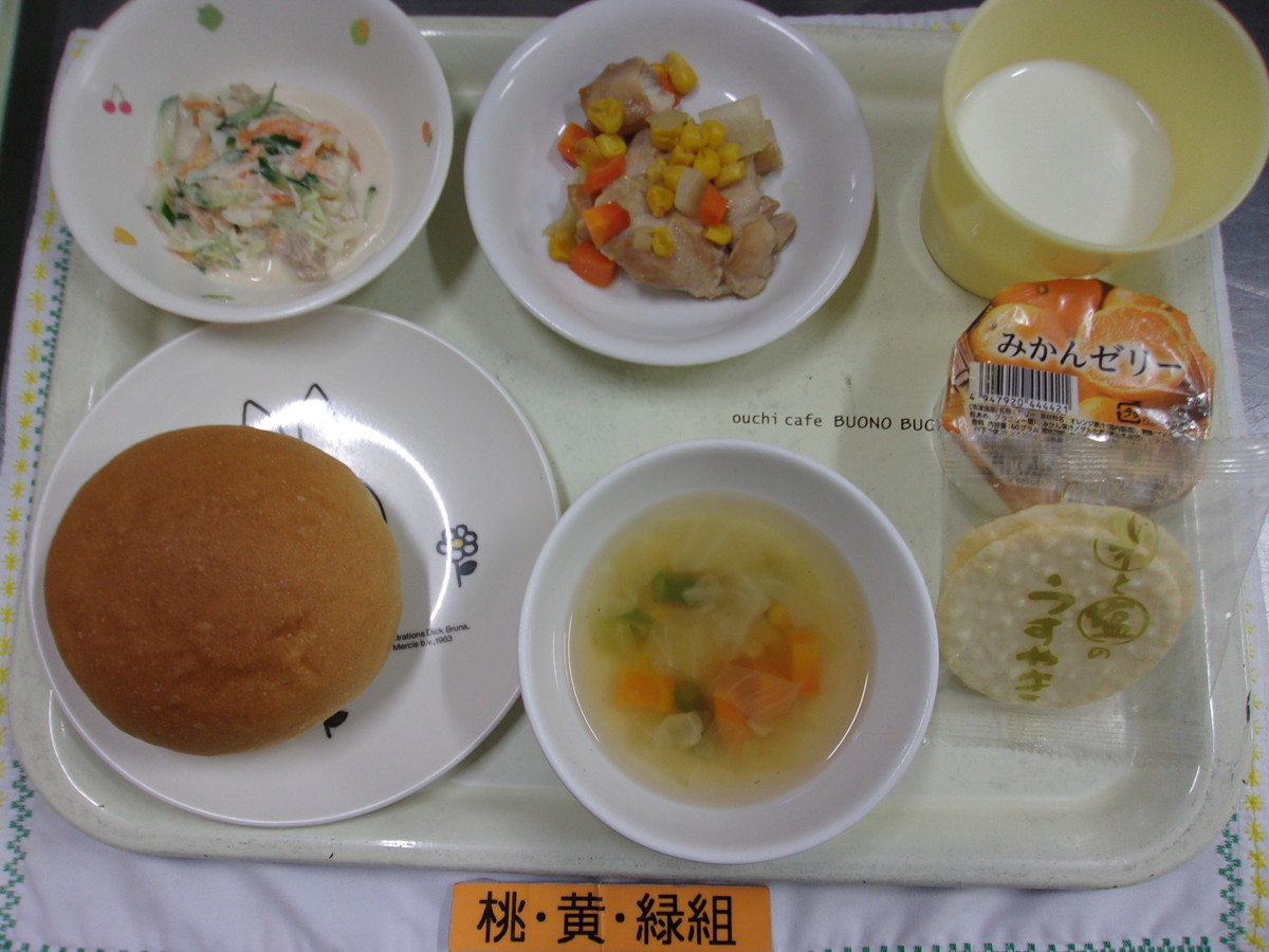 ロールパン 鶏肉とコーンオーブン焼き ツナサラダ コロコロスープ
