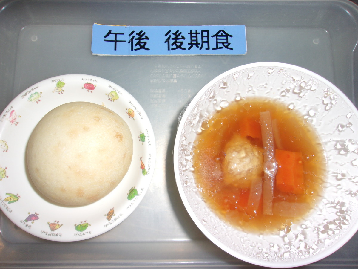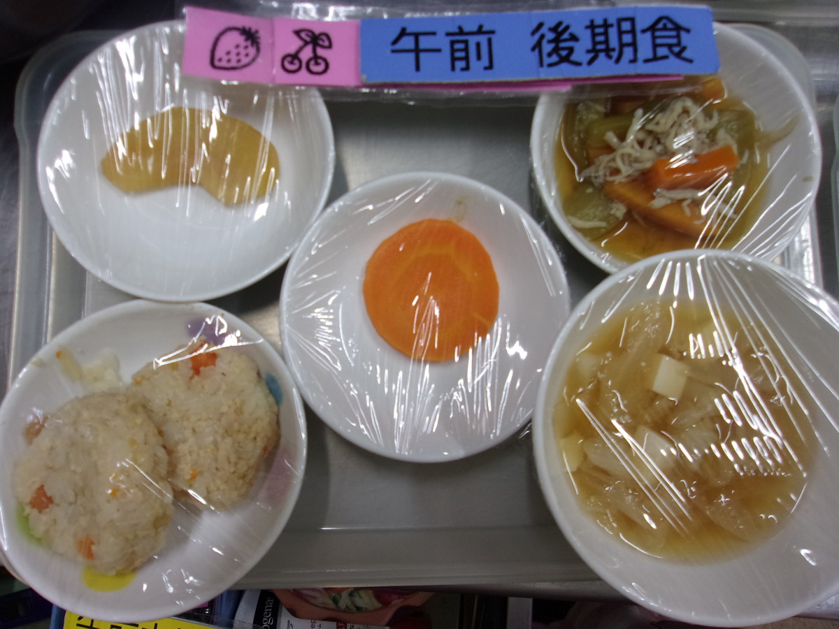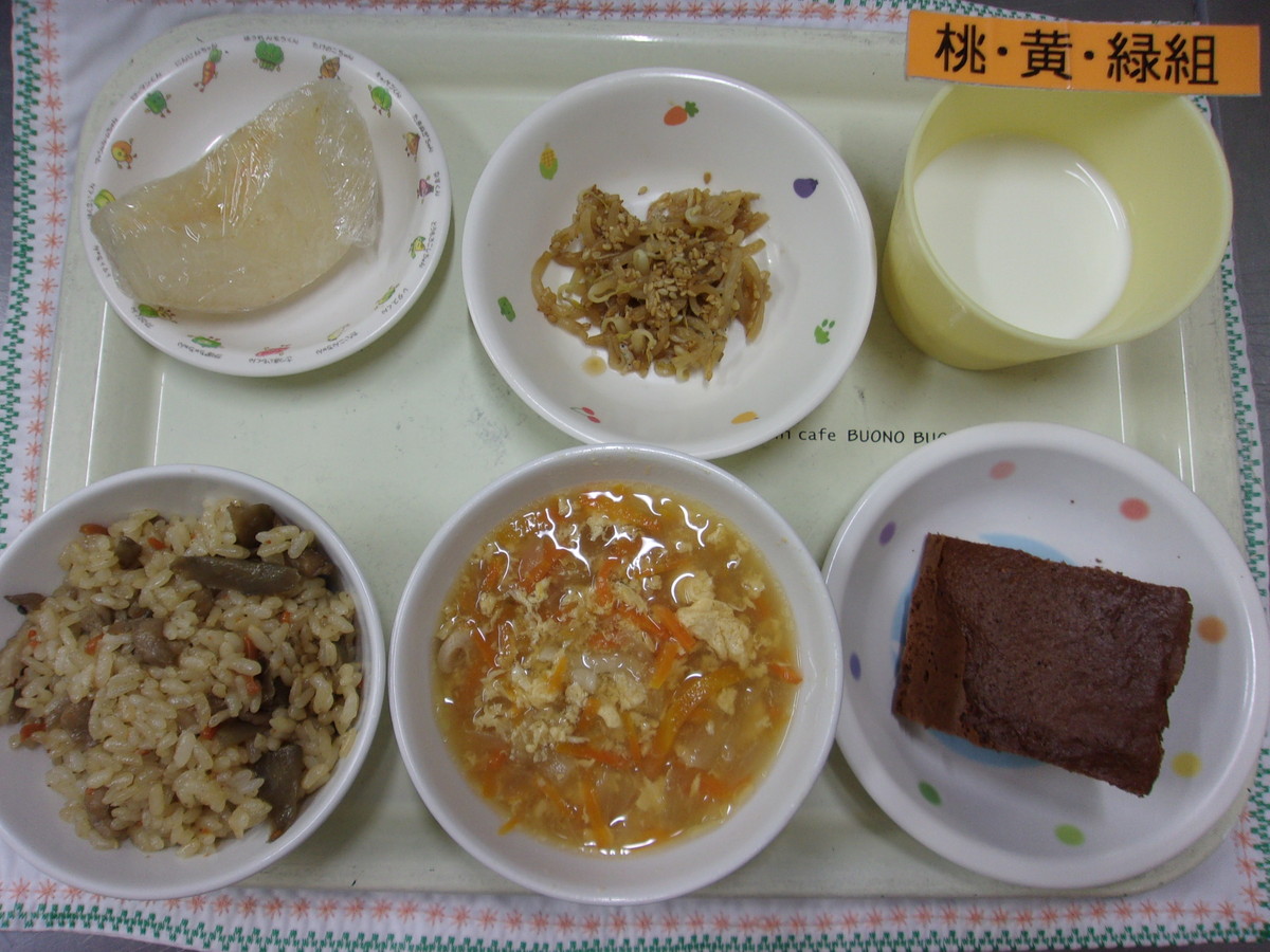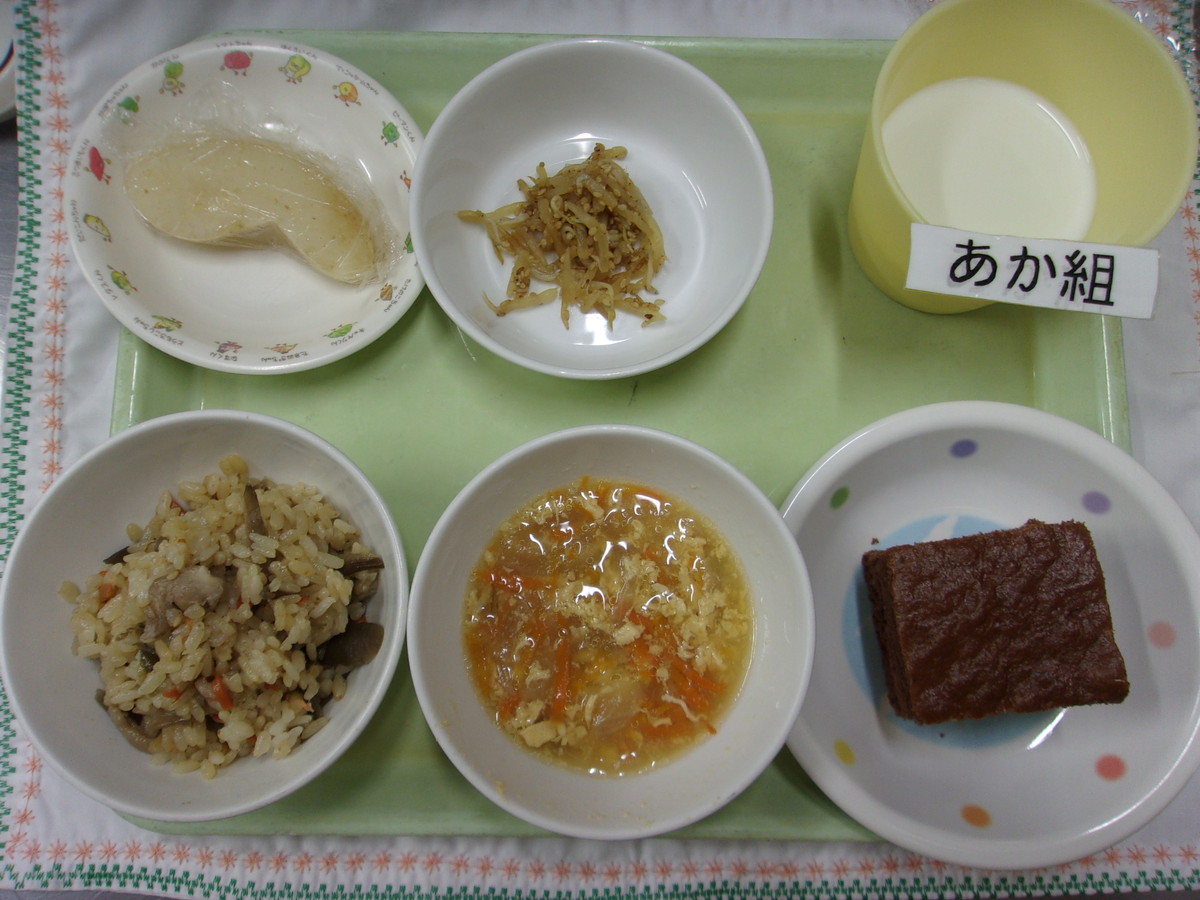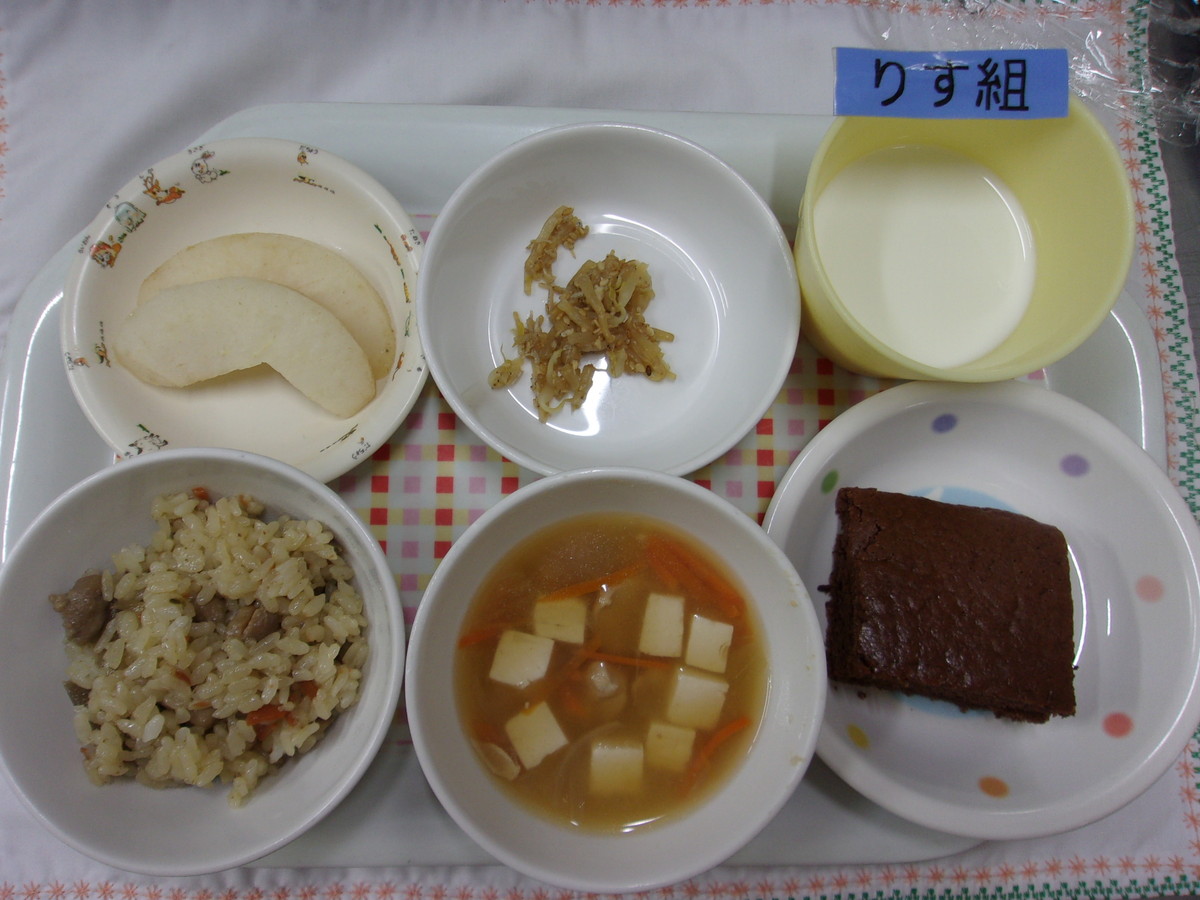 鶏ごぼうごはん じゃこの胡麻和え かきたま味噌汁 梨