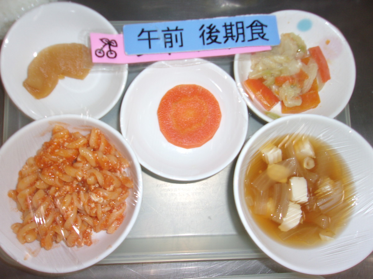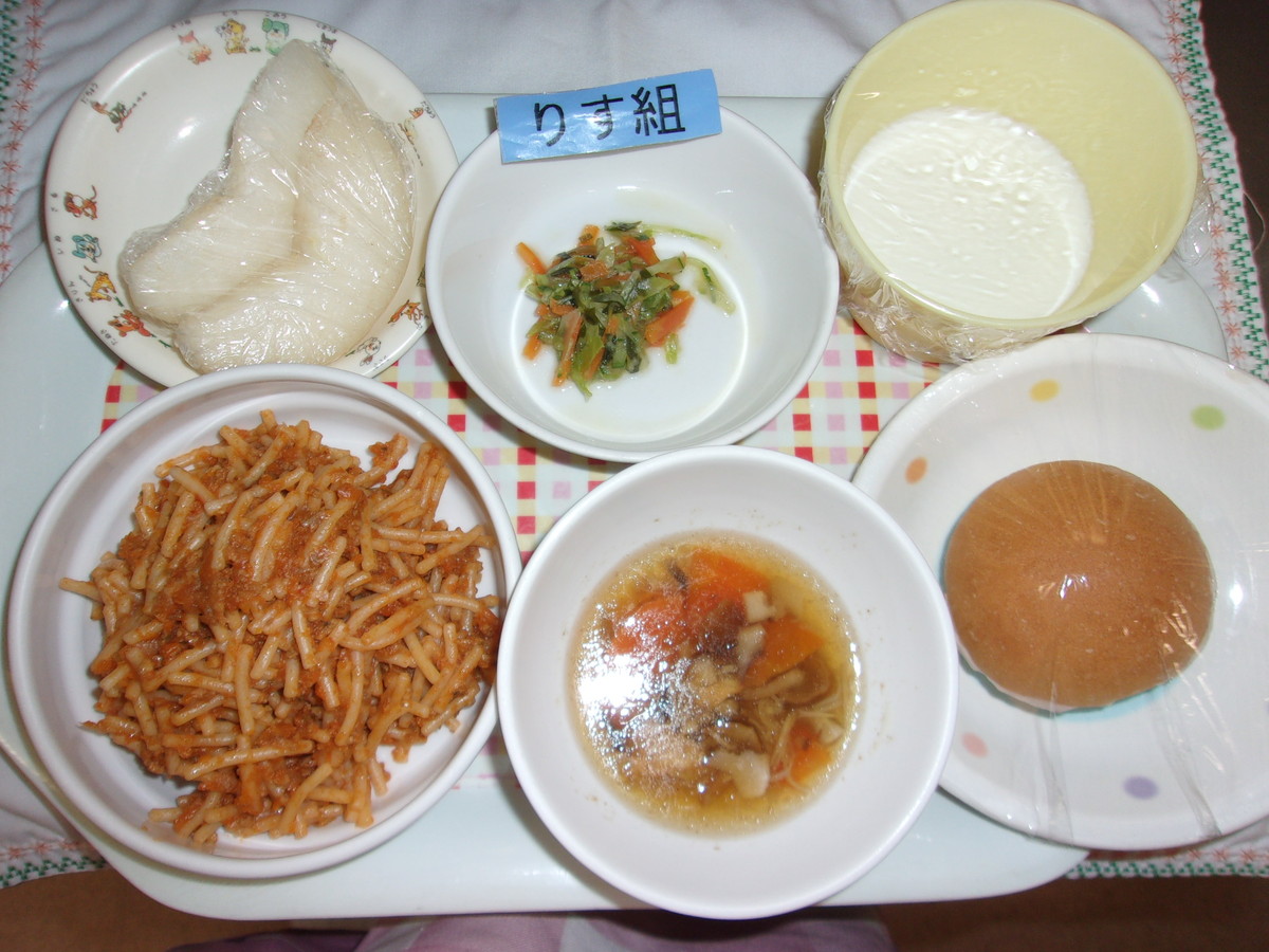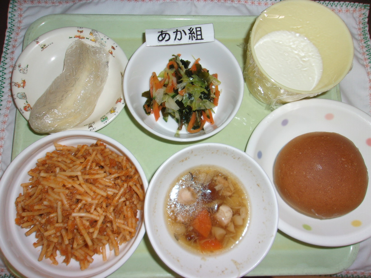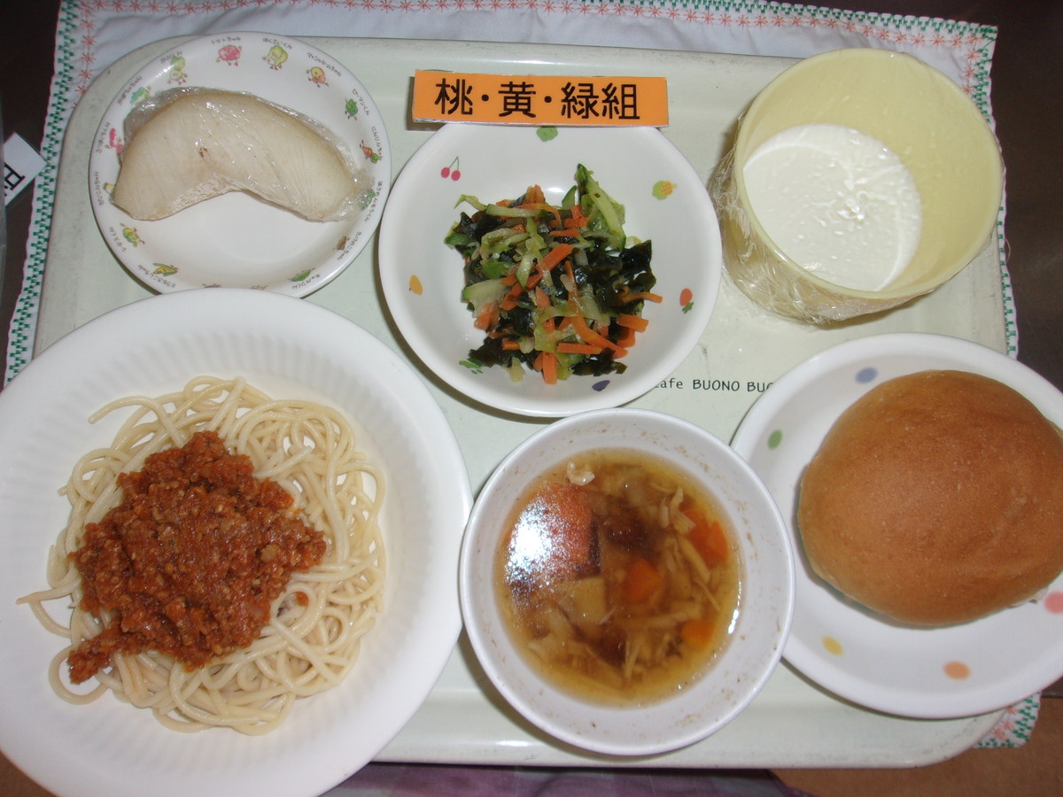 ミートソーススパゲティー わかめサラダ きのこスープ 梨