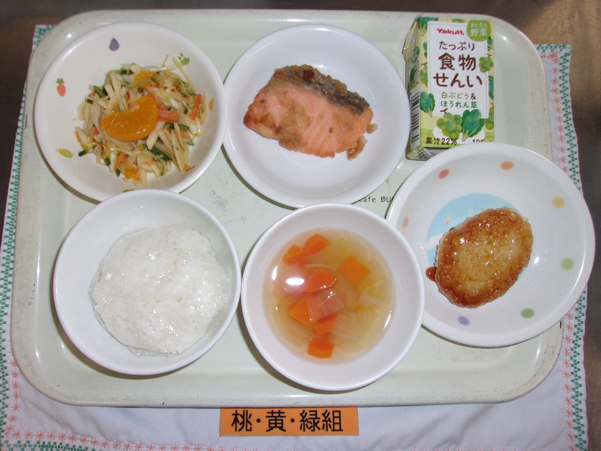 ごはん 鮭の味噌揚げ コーンスープ フルーツサラダ