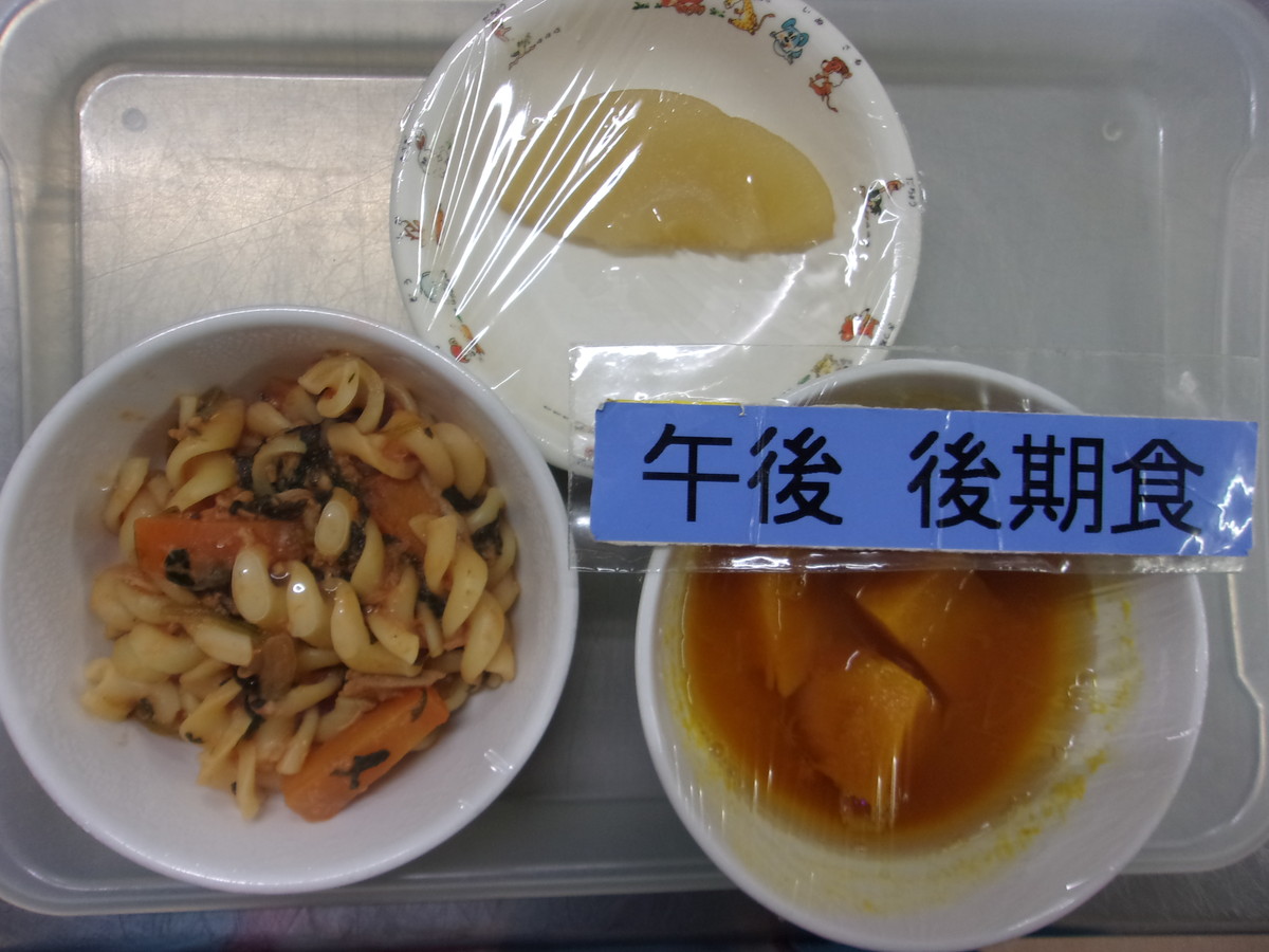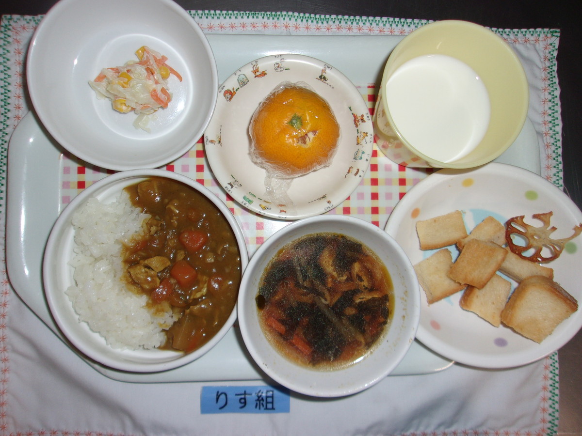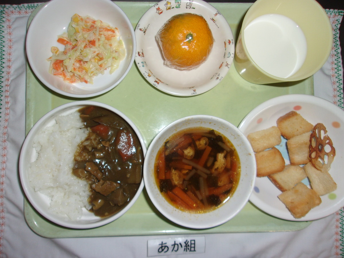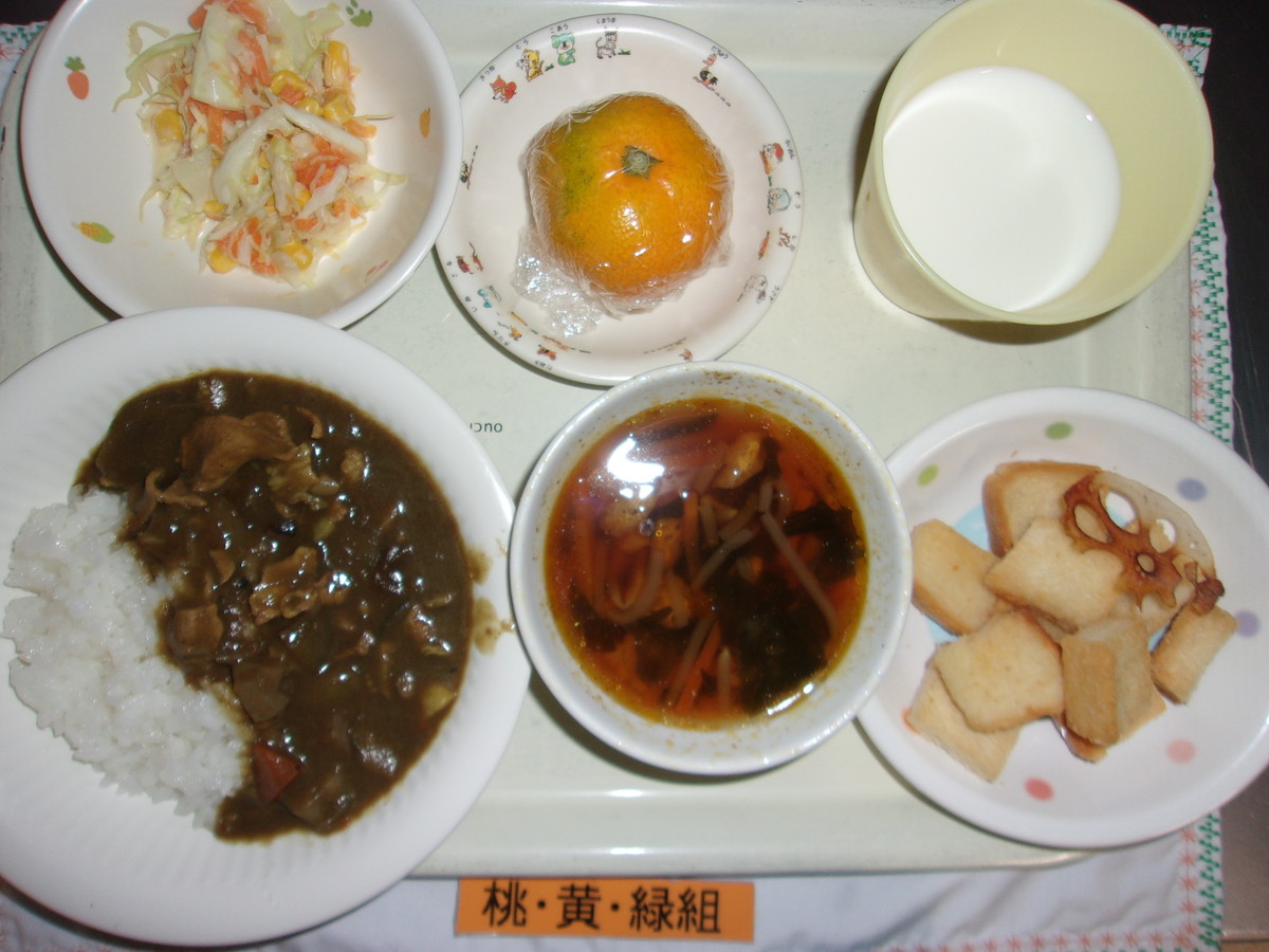 秋野菜カレー きゃべつコーンサラダ もやし味噌汁 みかん