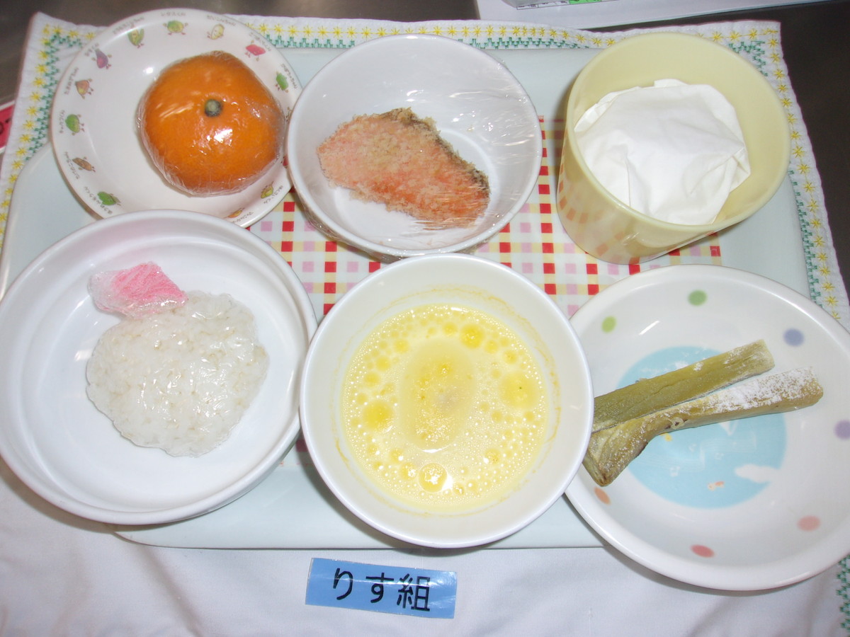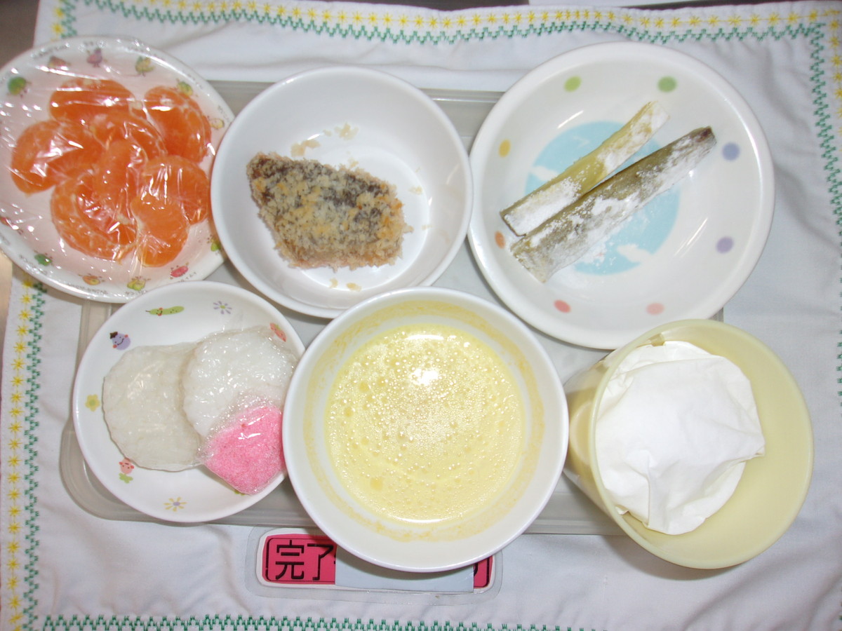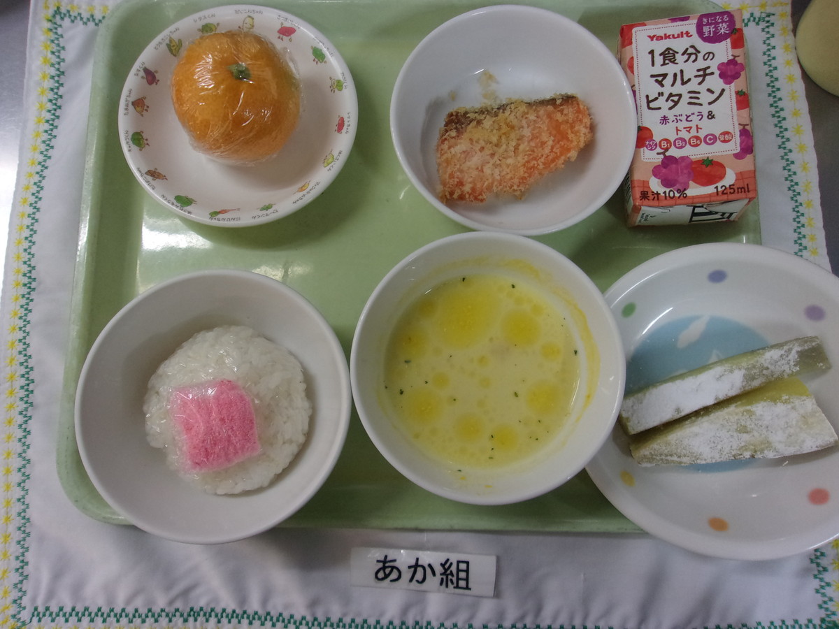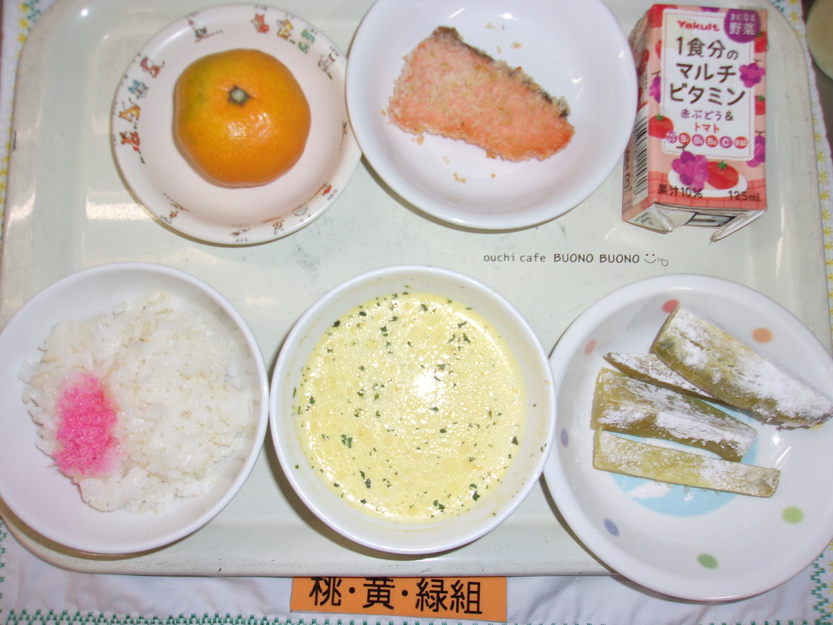 『さくらごはん 鮭のカリカリ揚げ かぼちゃポタージュスープ みかん』です。