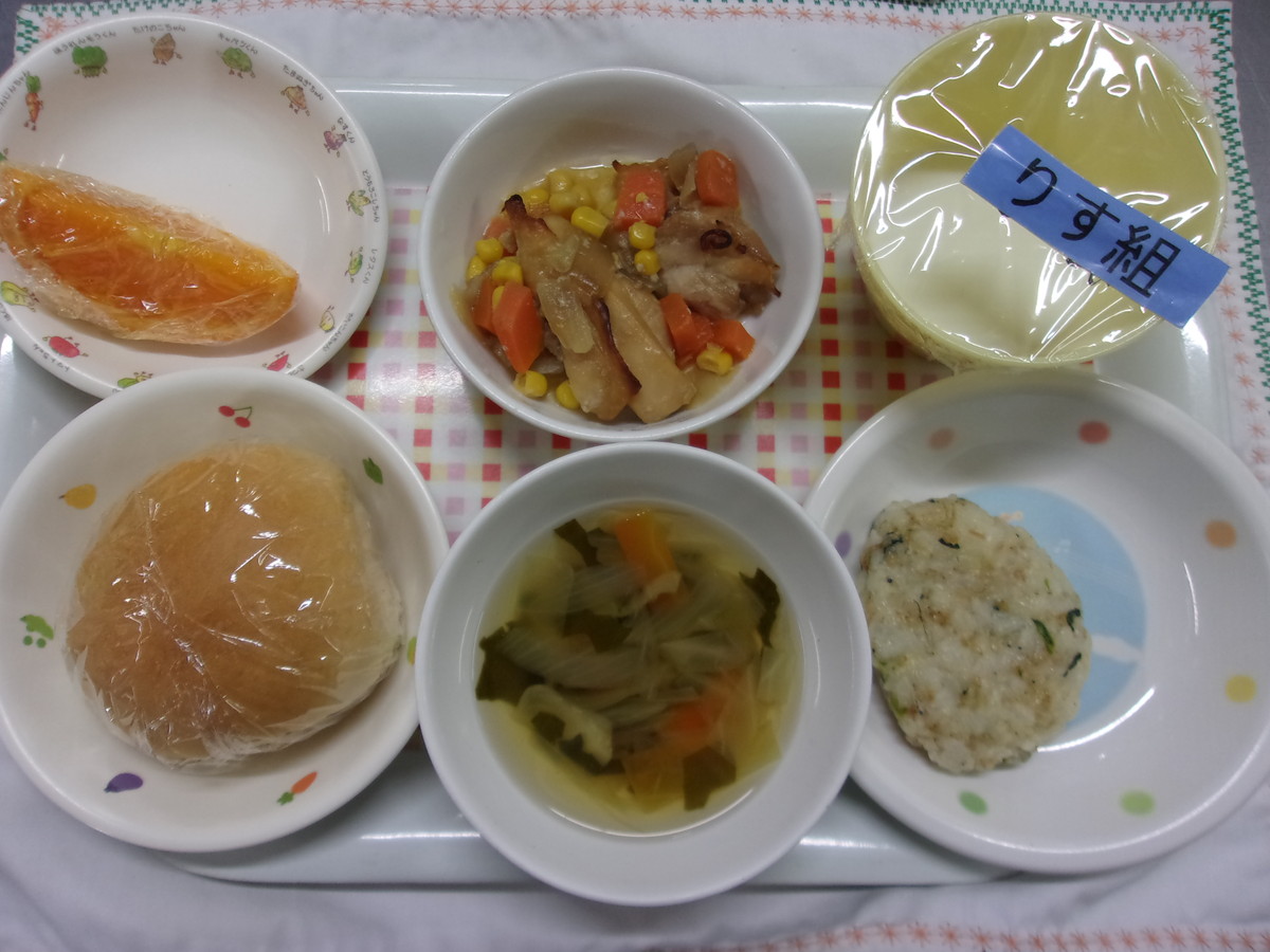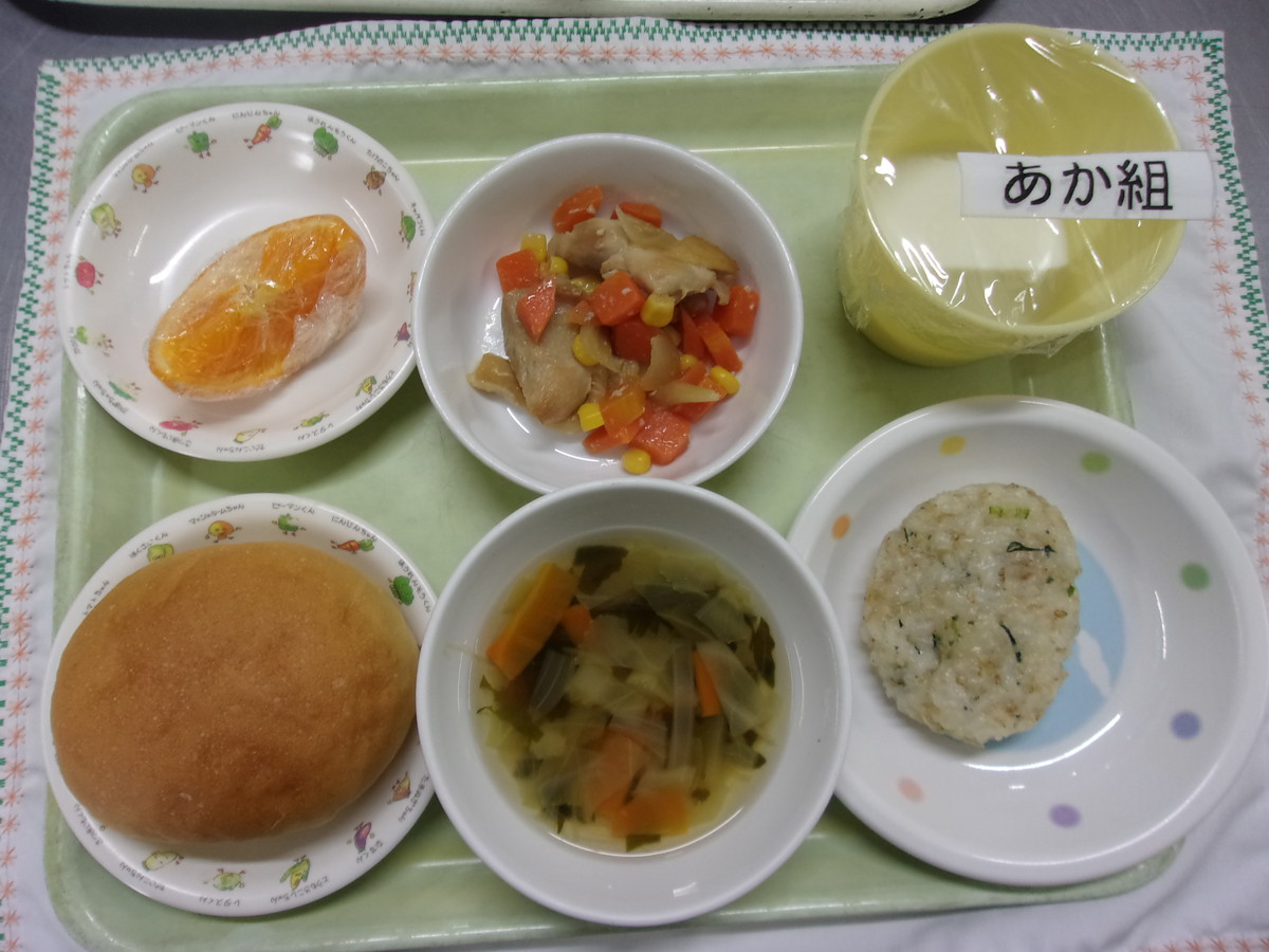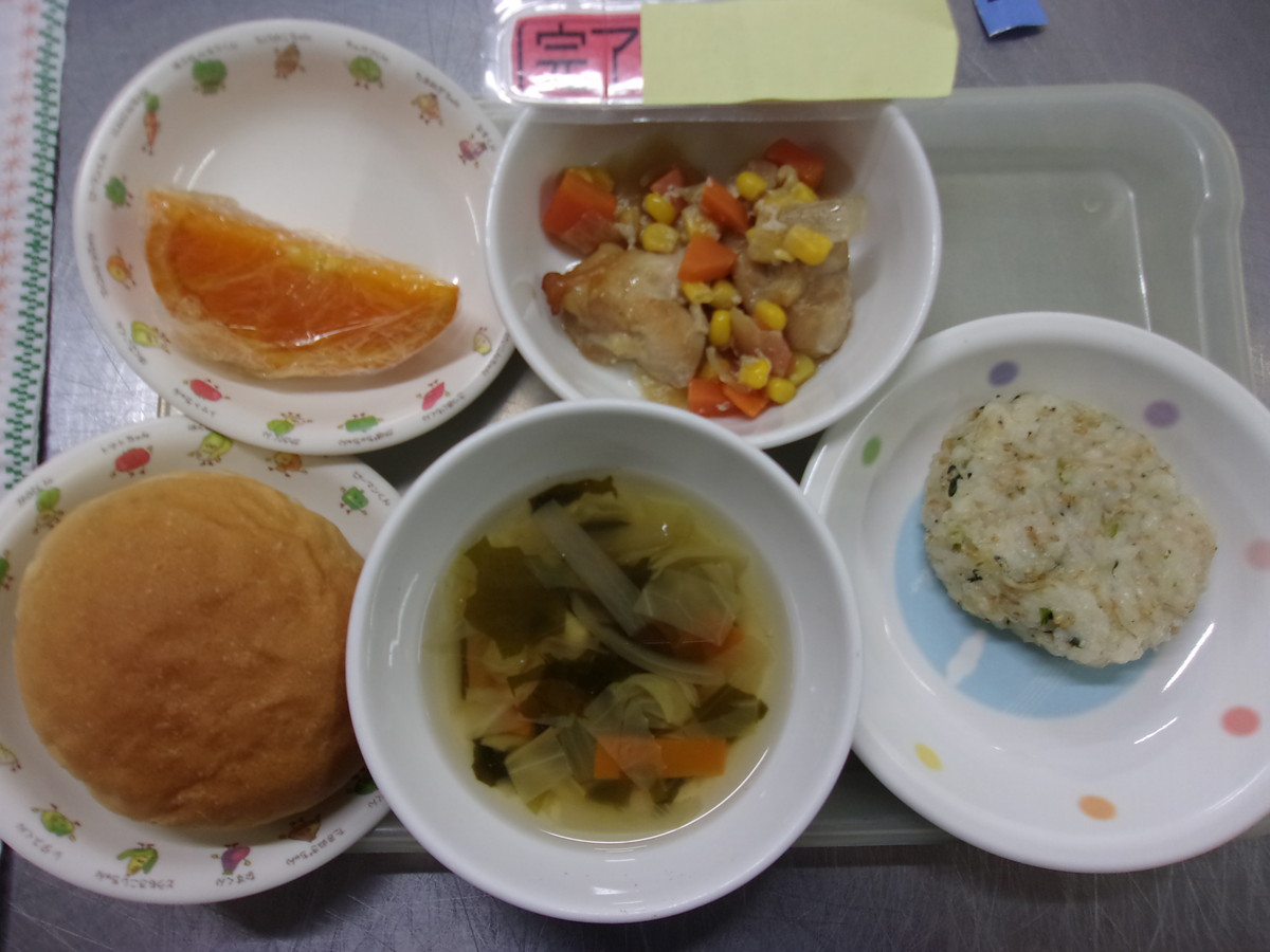 ロールパン 鶏肉オーブン焼き 野菜スープ みかん