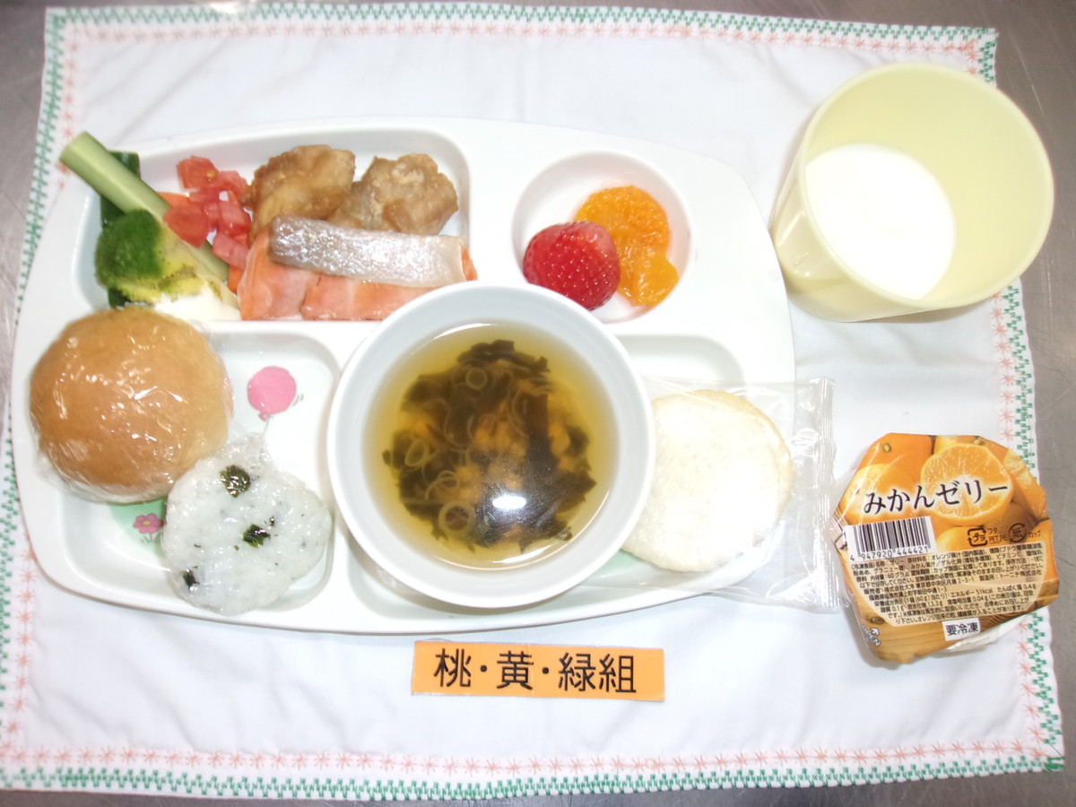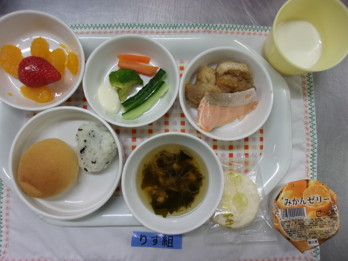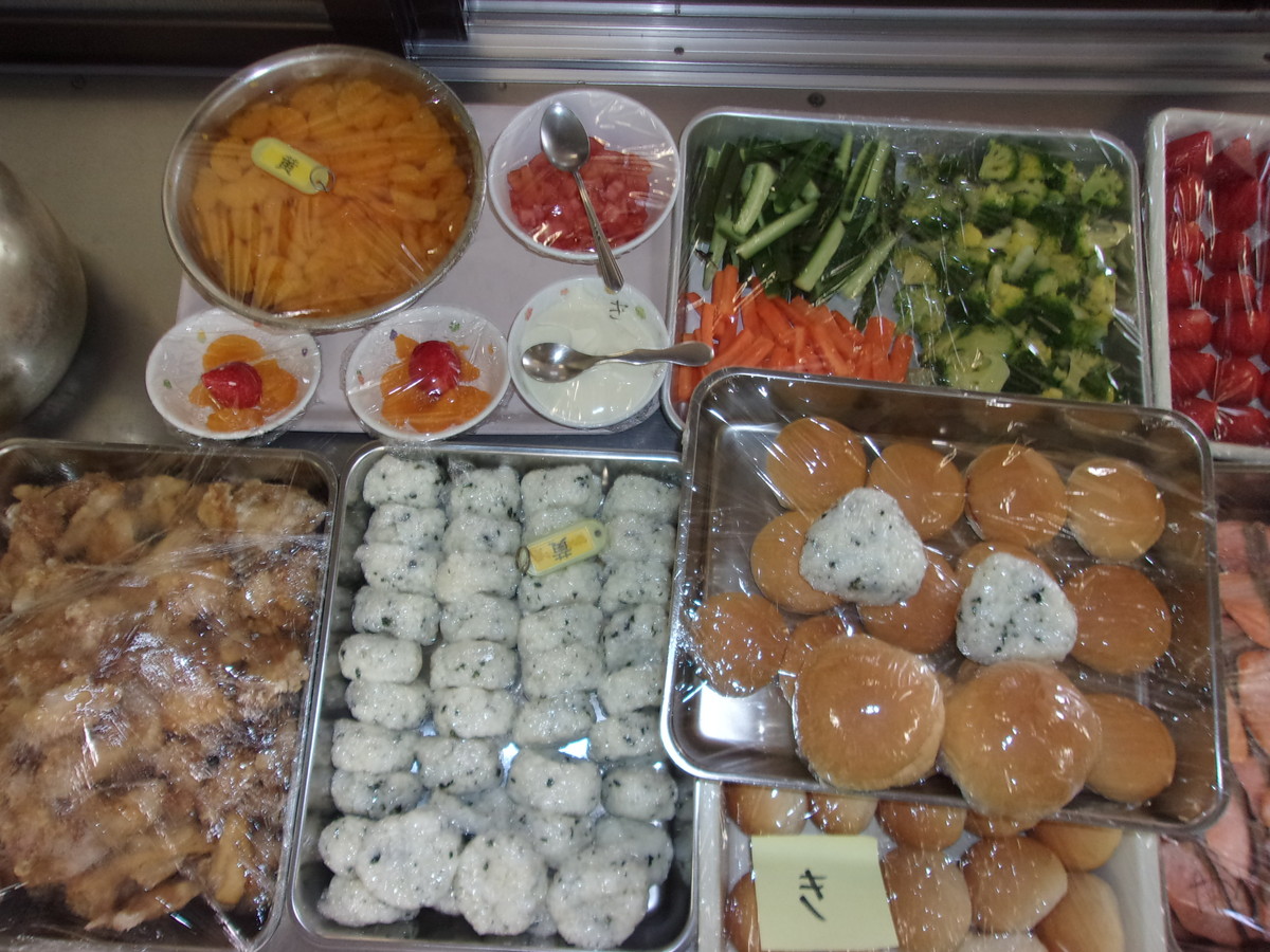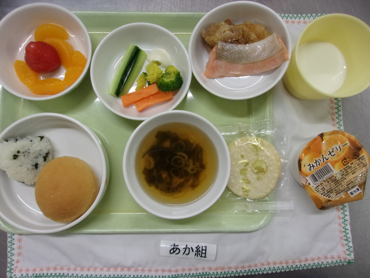 今日はお楽しみ給食でした。 わかめおにぎり ジャムサンド 鶏肉から揚げ 焼き鮭 ブロッコリー スティック人参 スティックきゅうり トマト イチゴ 缶みかん わかめとコーンのすまし汁でした。 赤組から年長まで クラスバイキングを楽しみました。 降園時子ども達がサンプルケースの前で『バイキング楽しかったよ から揚げ美味しかった~ メニューを全部お父さんお母さんに説明している声が聞こえてきて とてもうれしくなりました。 カテゴリー:給食