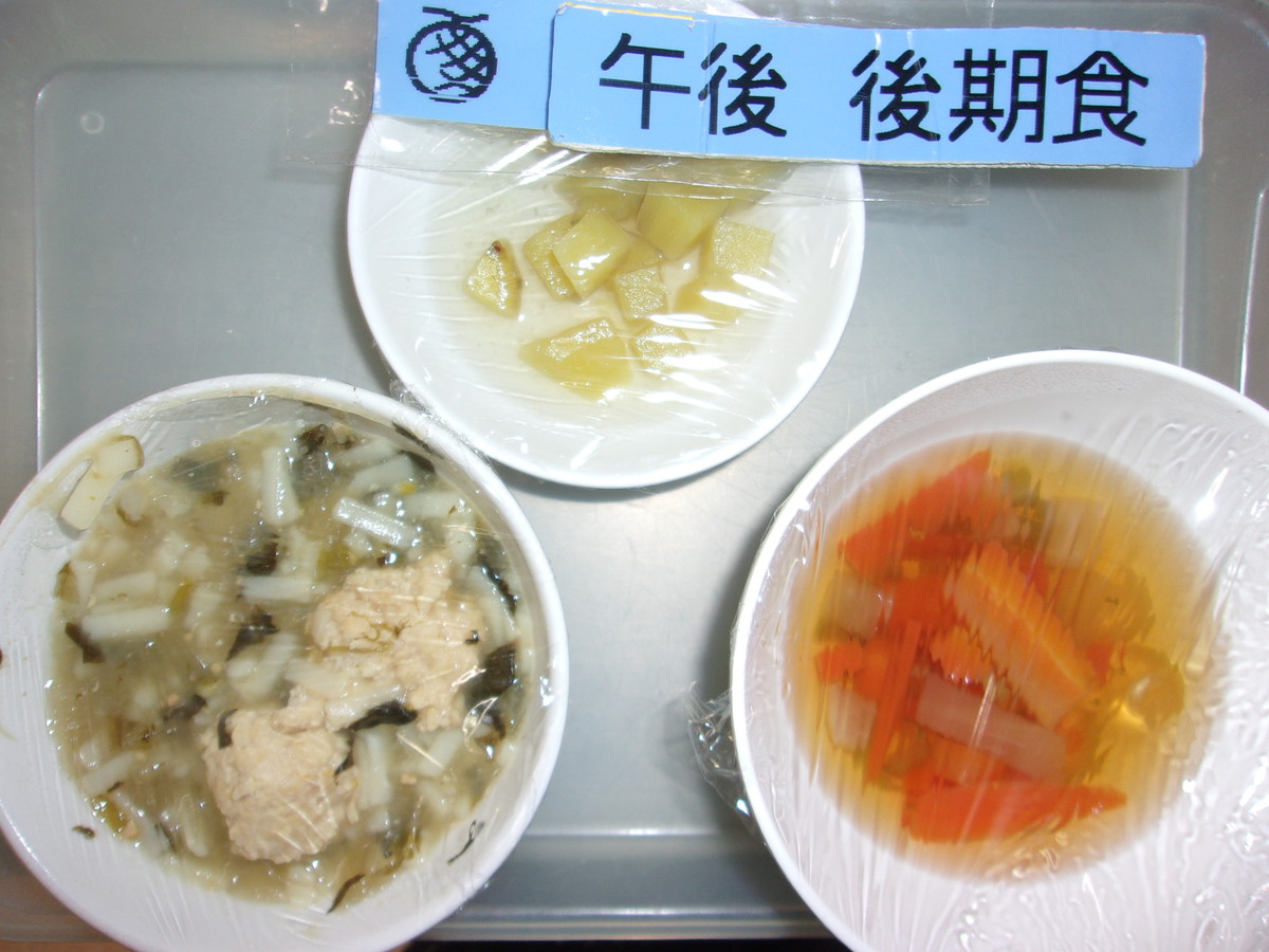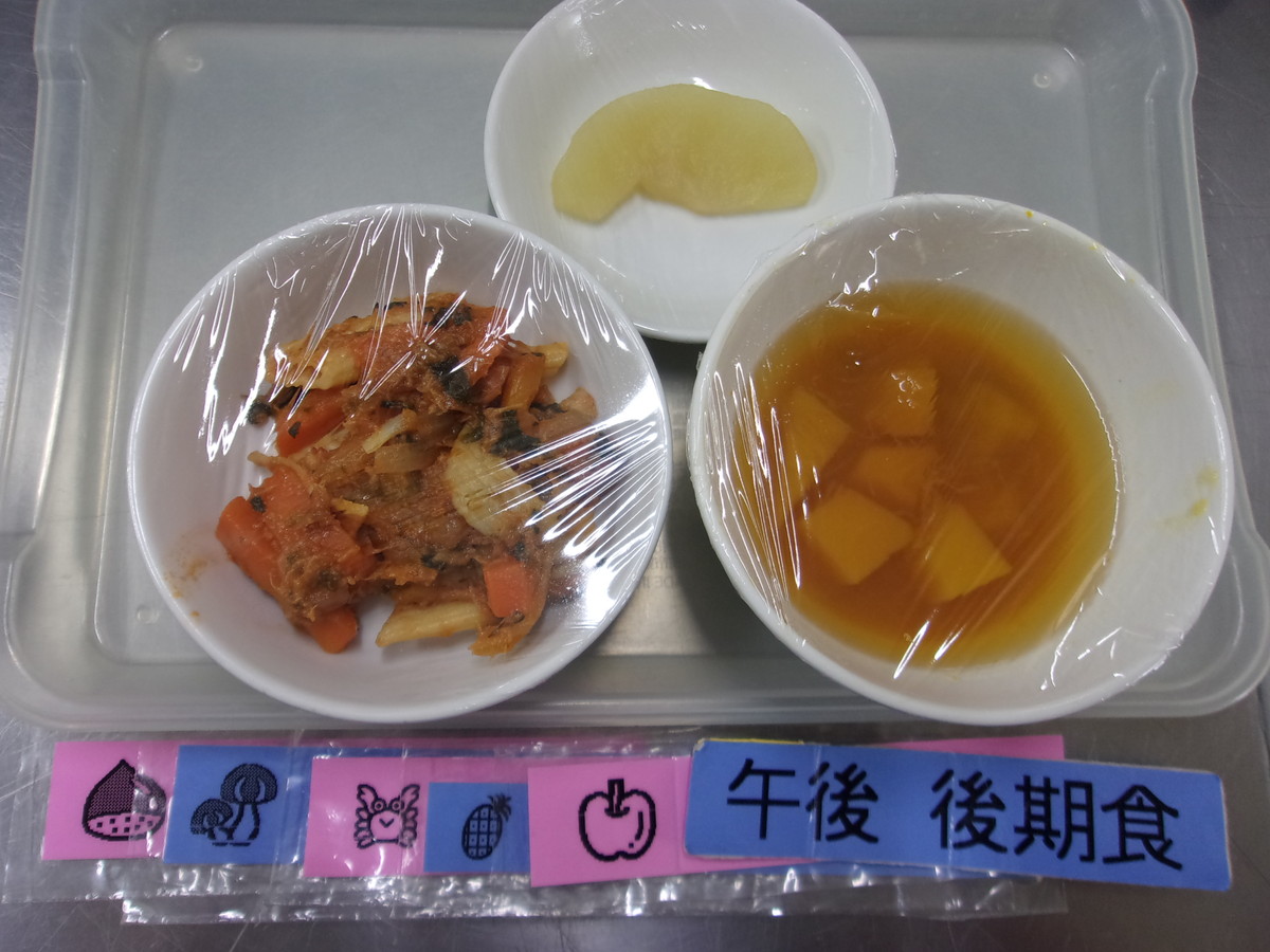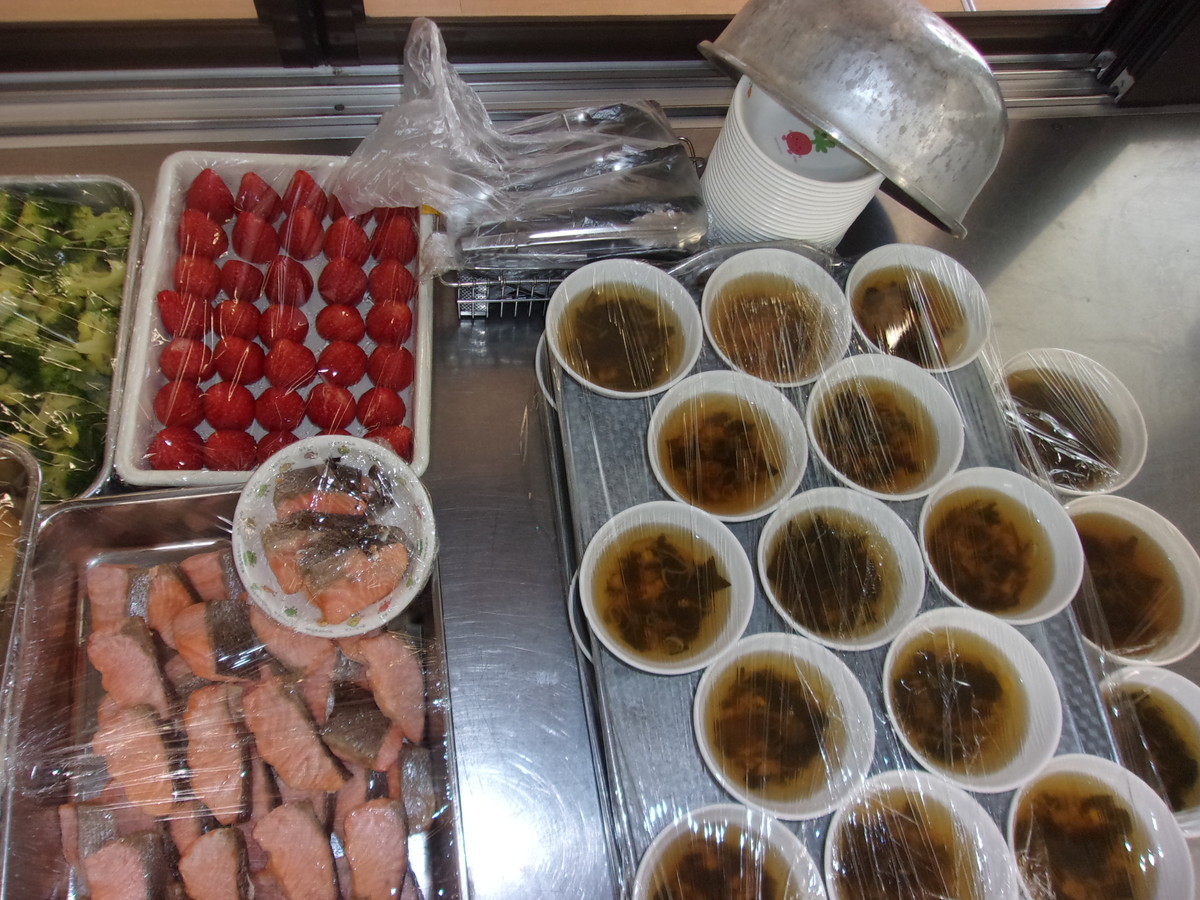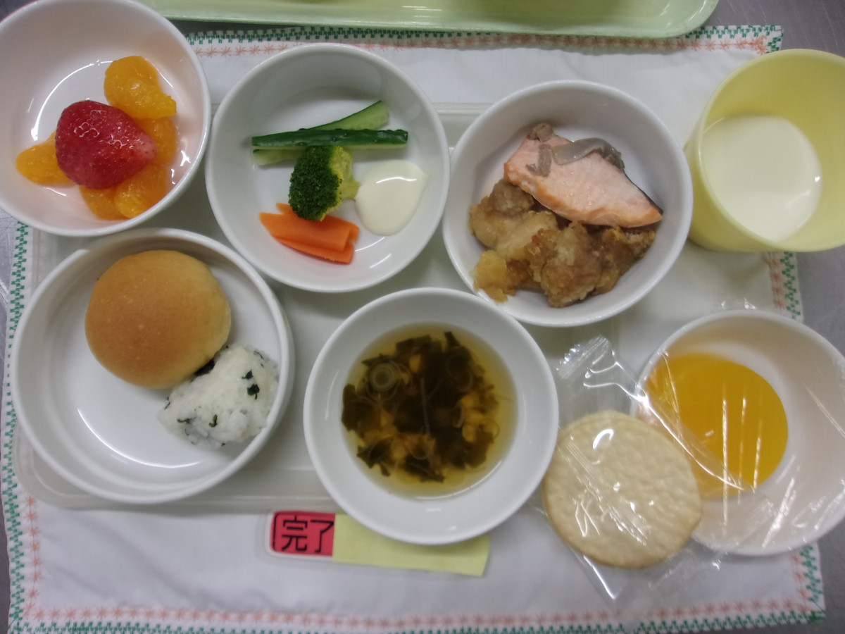 今日はお楽しみ給食でした。 わかめおにぎり ジャムサンド 鶏肉から揚げ 焼き鮭 ブロッコリー スティック人参 スティックきゅうり トマト イチゴ 缶みかん わかめとコーンのすまし汁でした。 赤組から年長まで クラスバイキングを楽しみました。 降園時子ども達がサンプルケースの前で『バイキング楽しかったよ から揚げ美味しかった~ メニューを全部お父さんお母さんに説明している声が聞こえてきて とてもうれしくなりました。 カテゴリー:給食