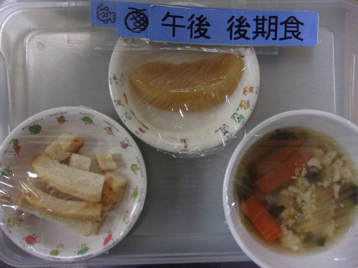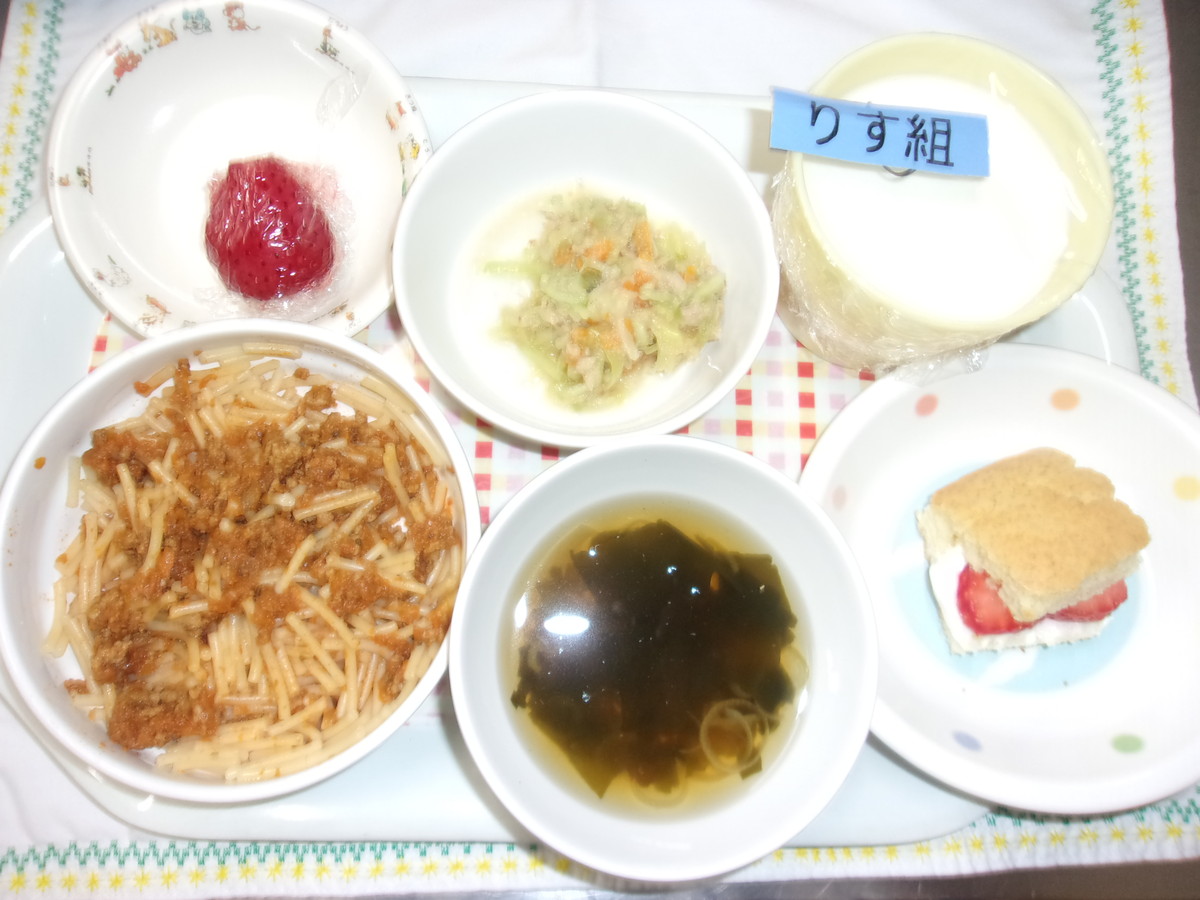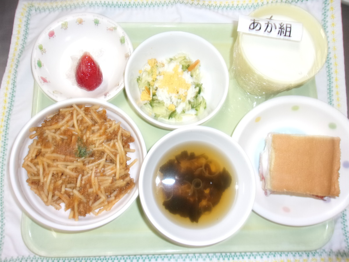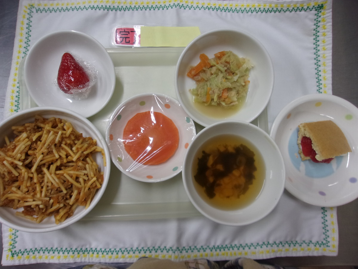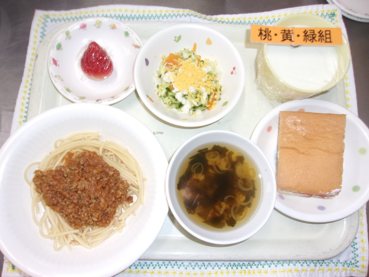 ミートソーススパゲティー 茹で卵サラダ コーンスープ いちご