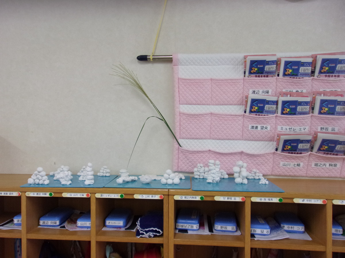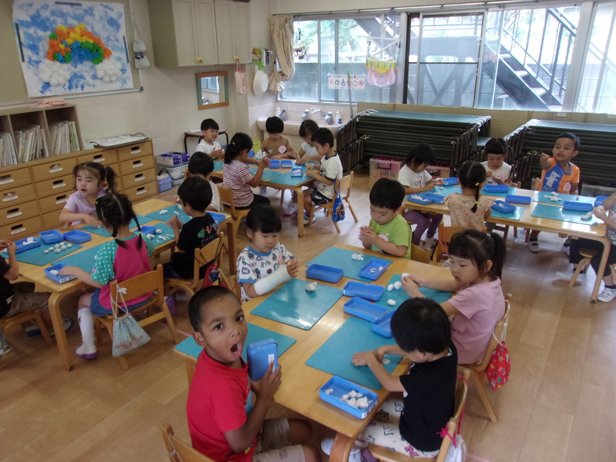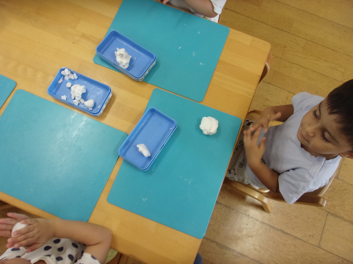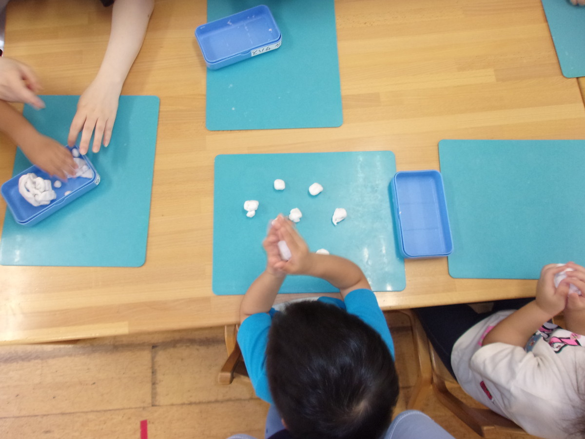 赤組、リス組はペーパーを丸めてお団子を作りました。