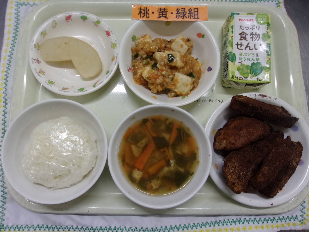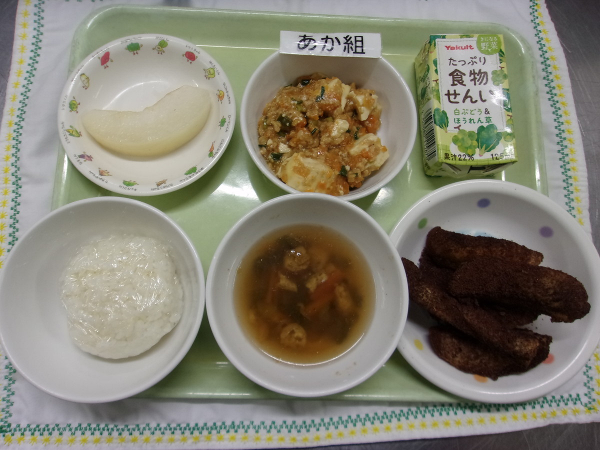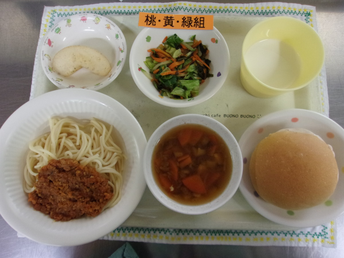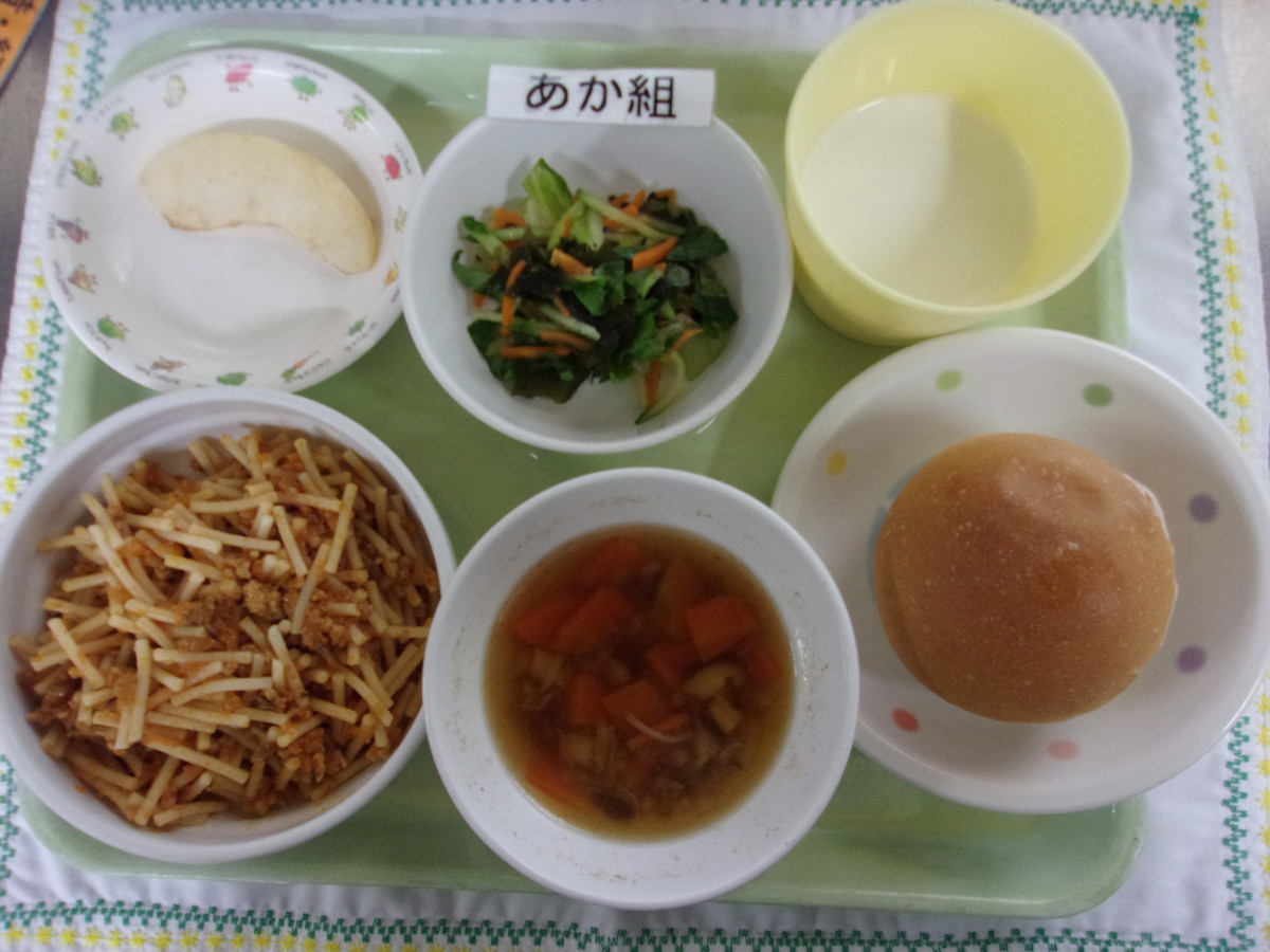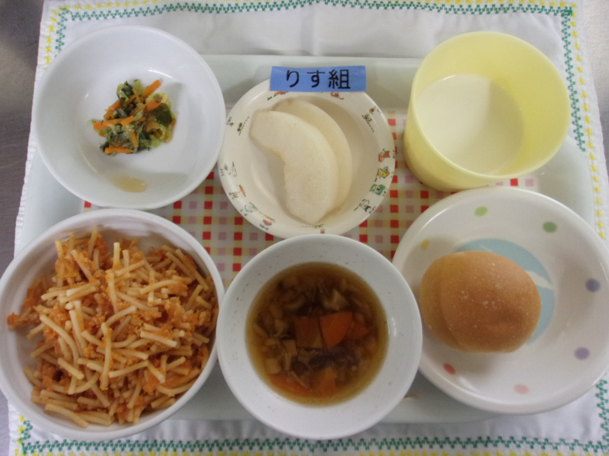 ミートソーススパゲティー わかめサラダ きのこスープ 梨です。