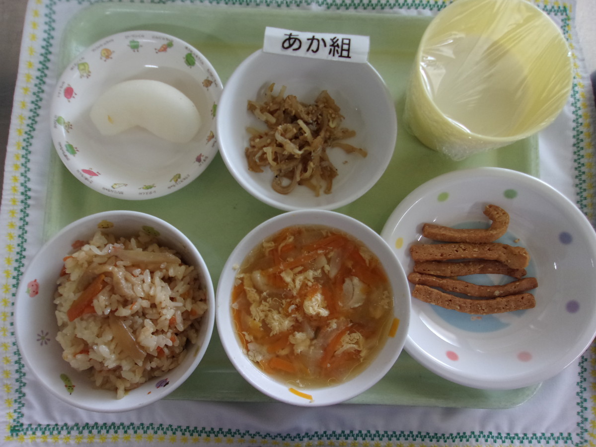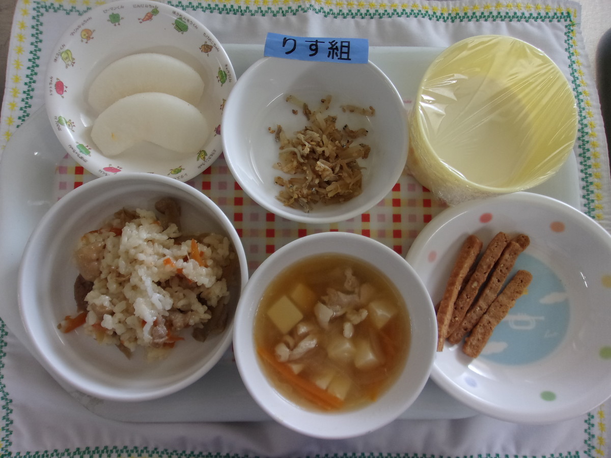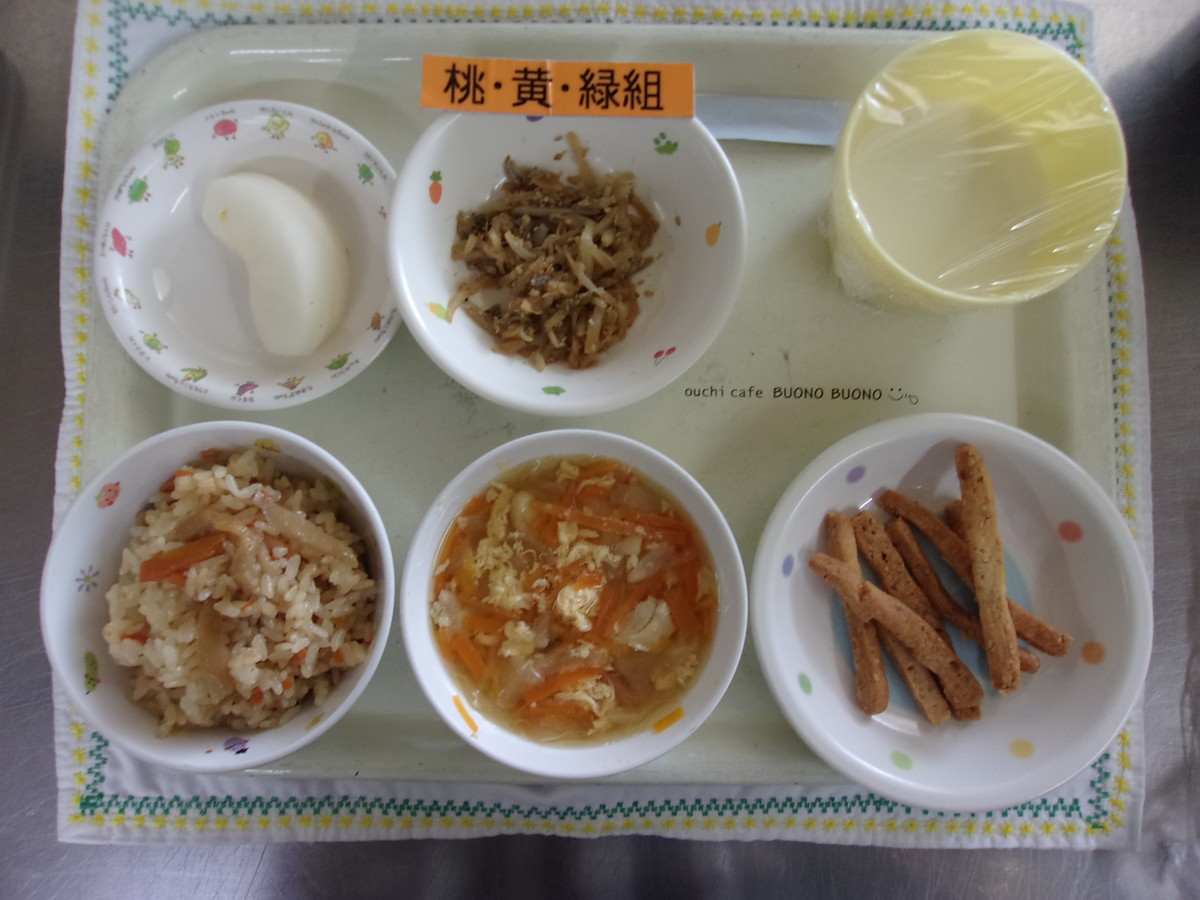 とりごぼうごはん かきたま汁 ジャコの胡麻和え 梨