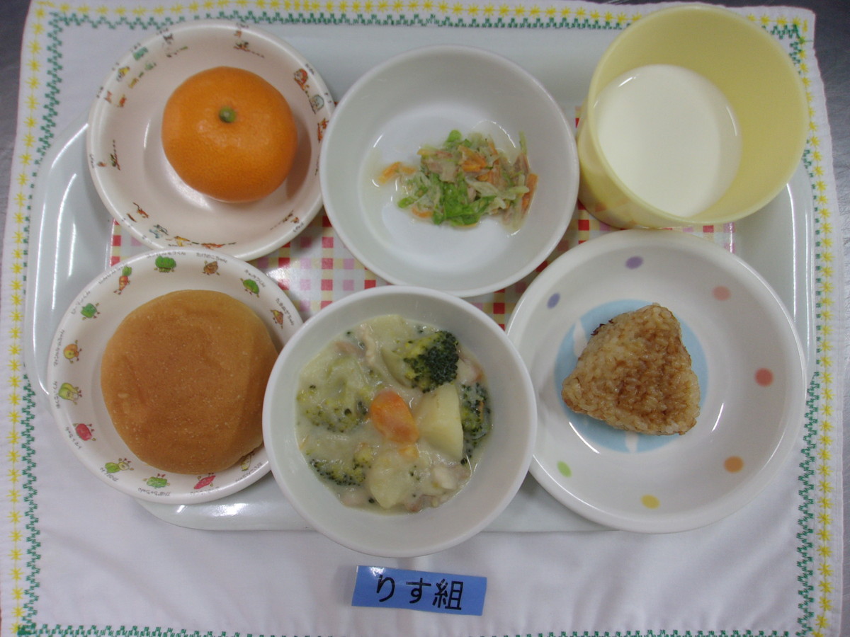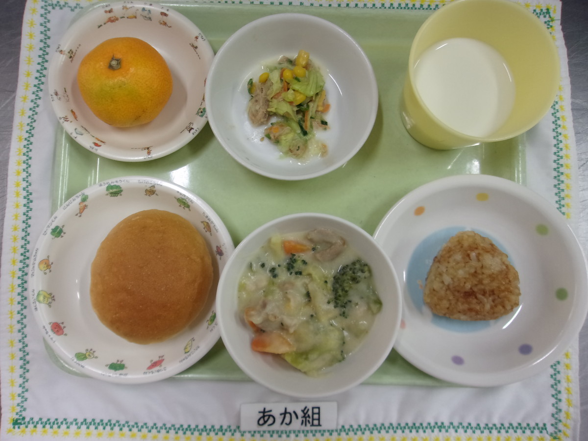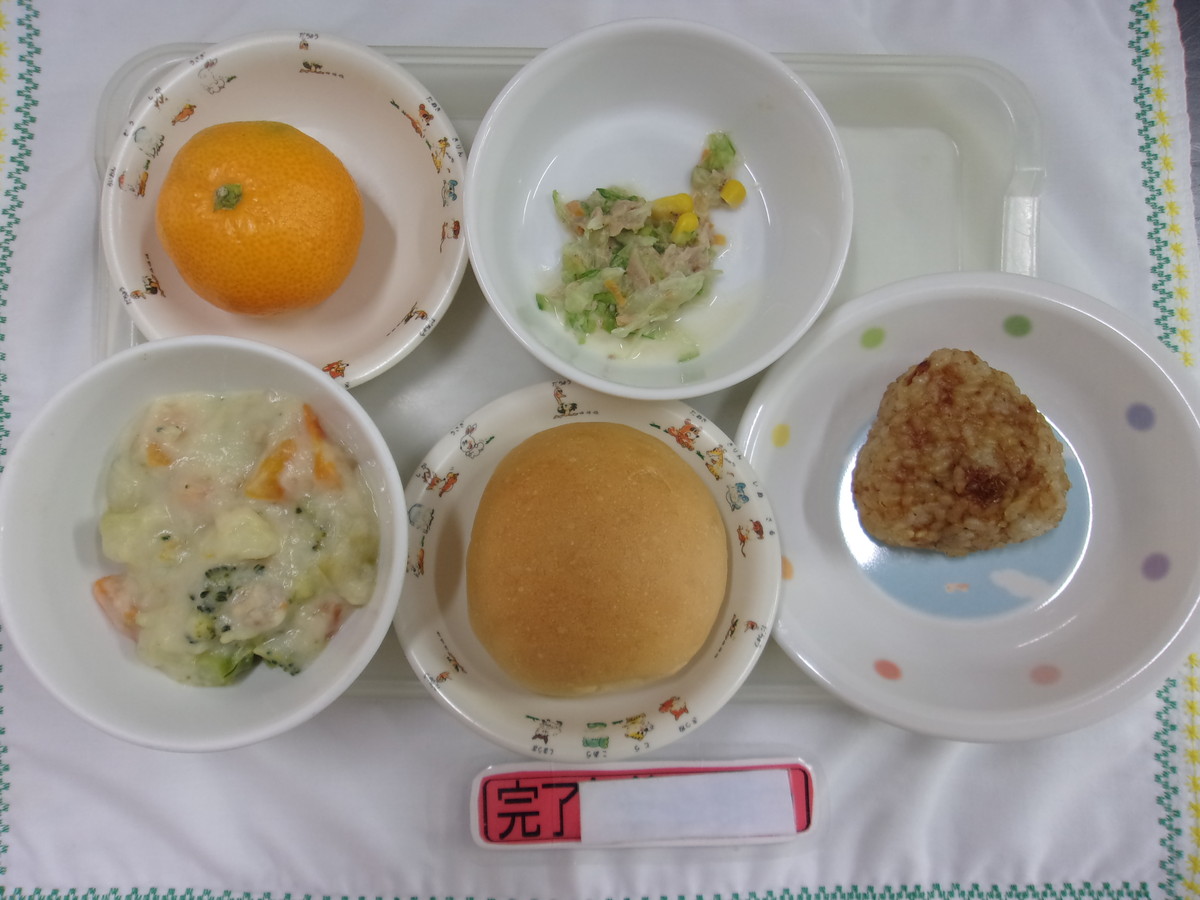ロールパン ブロッコリーシチュー 和風サラダ みかん