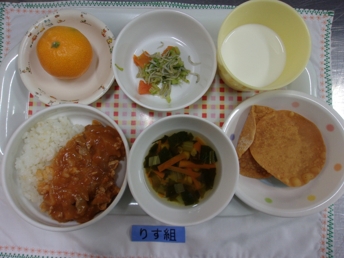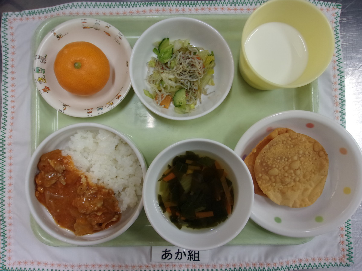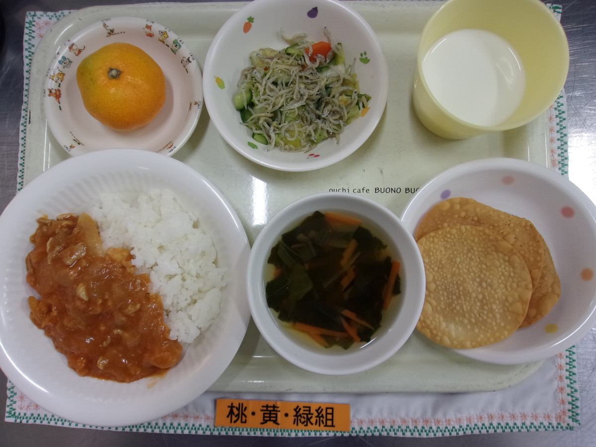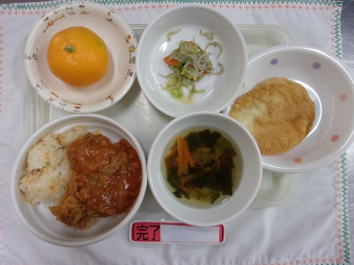ハヤシライス 炒りじゃこサラダ わかめとコーンのスープ みかん