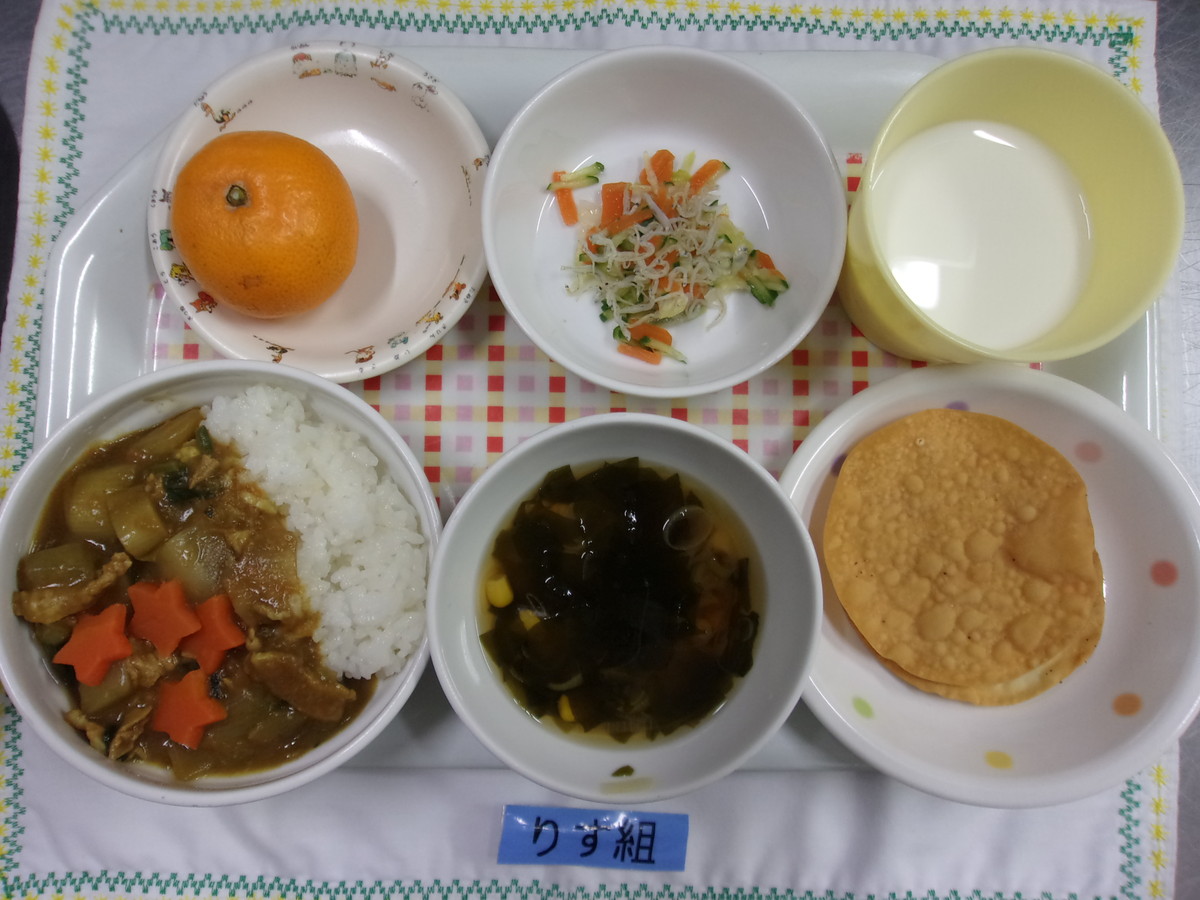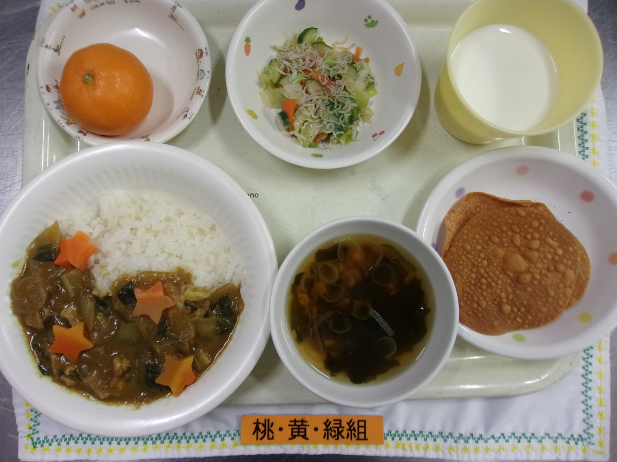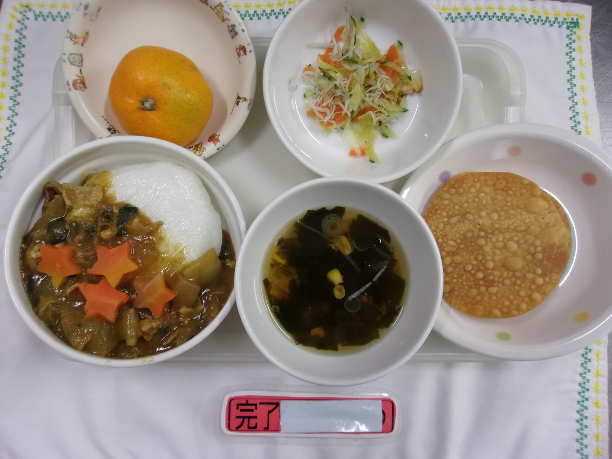 今日の給食は『冬野菜クリスマスカレー 炒りじゃこサラダ わかめとコーンのスープ