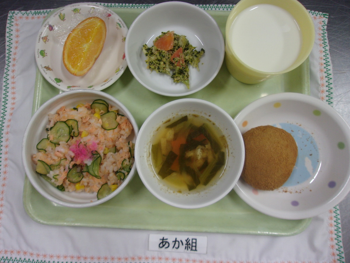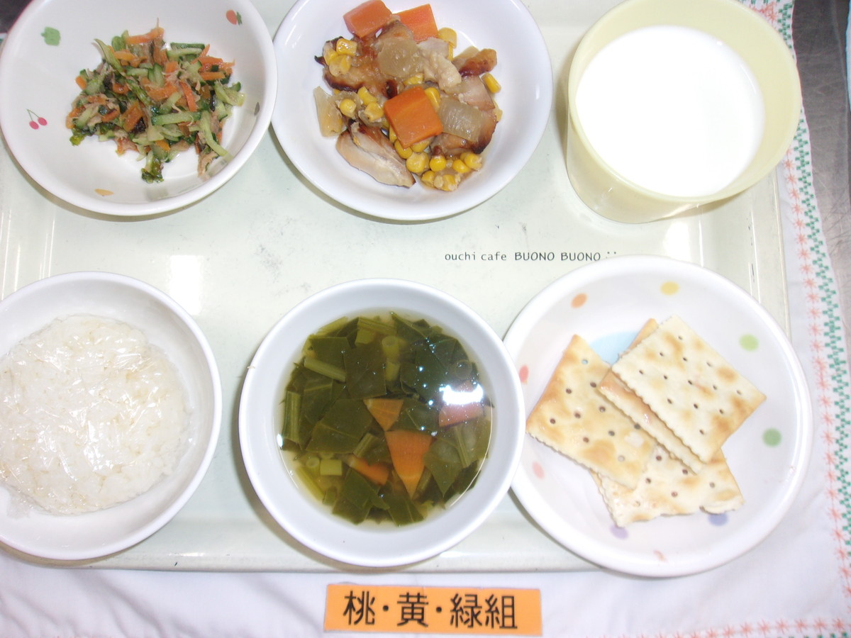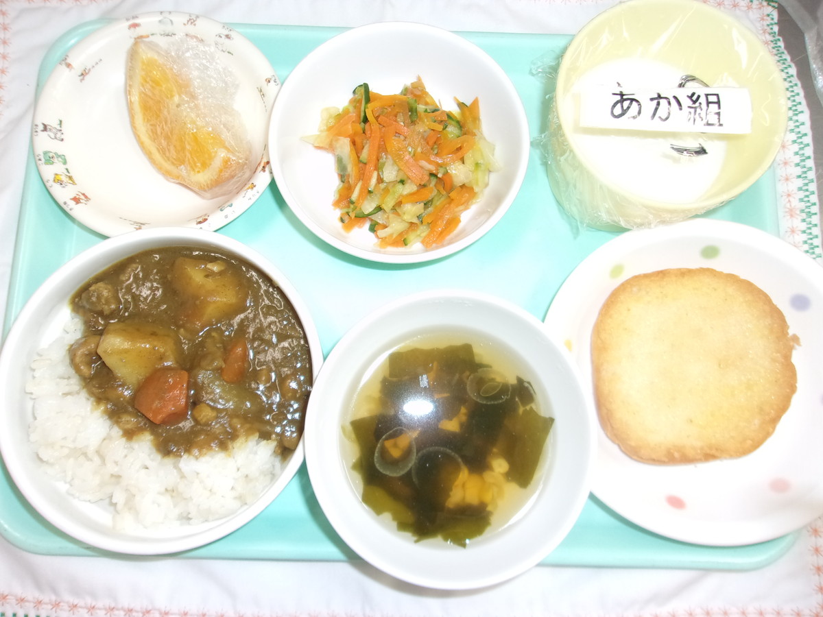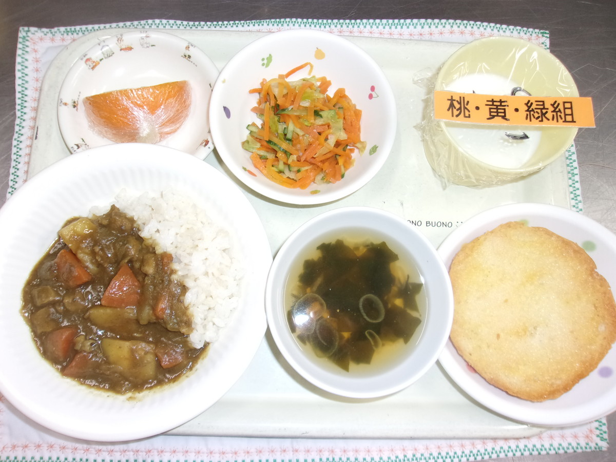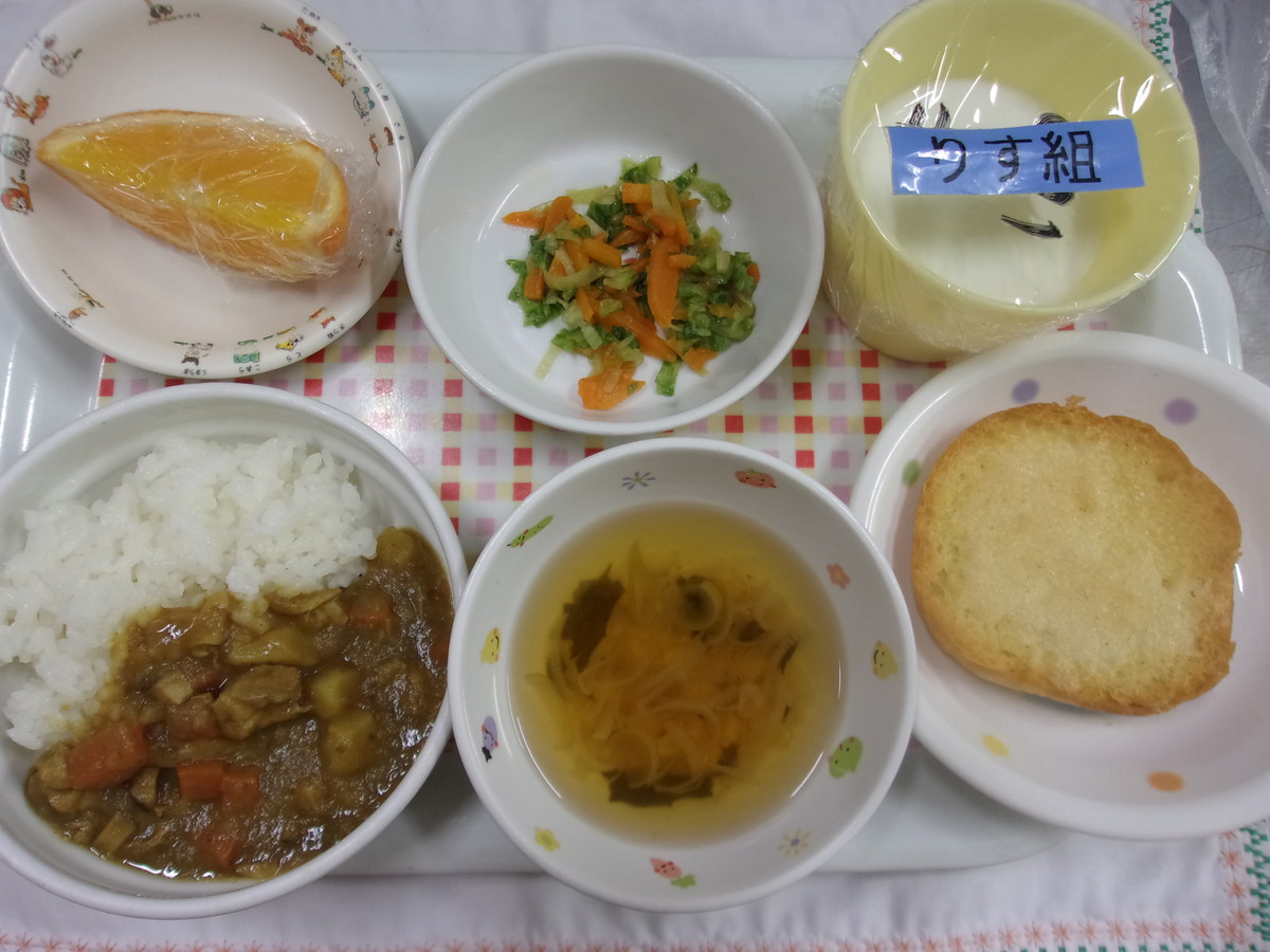 今日の給食は チキンカレーライス 人参サラダ すまし汁