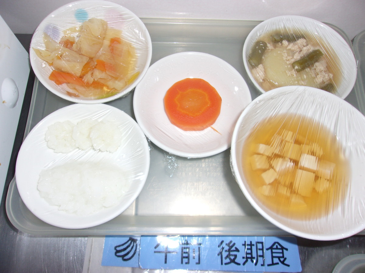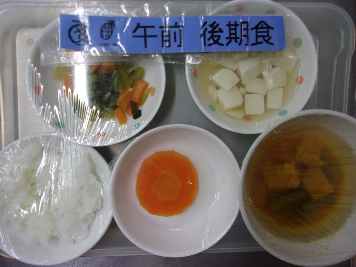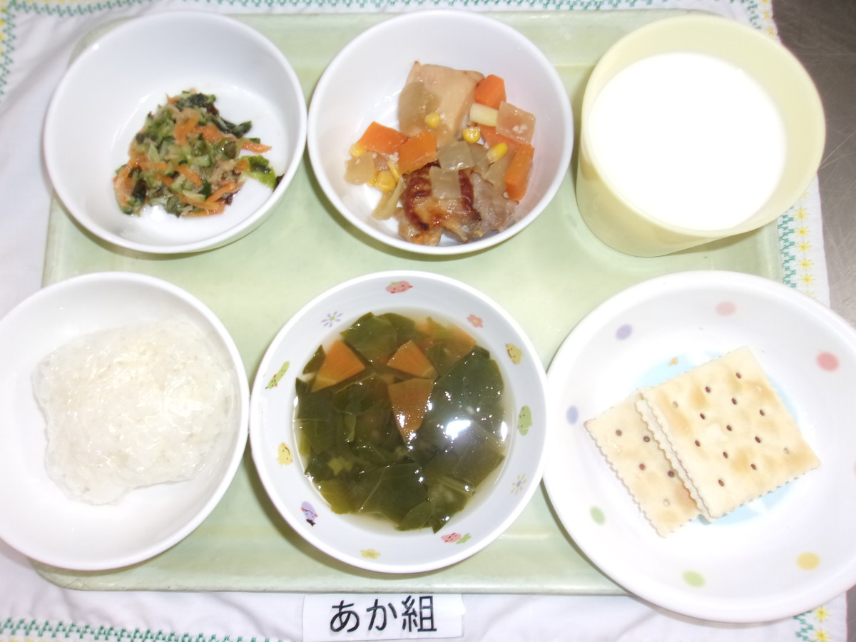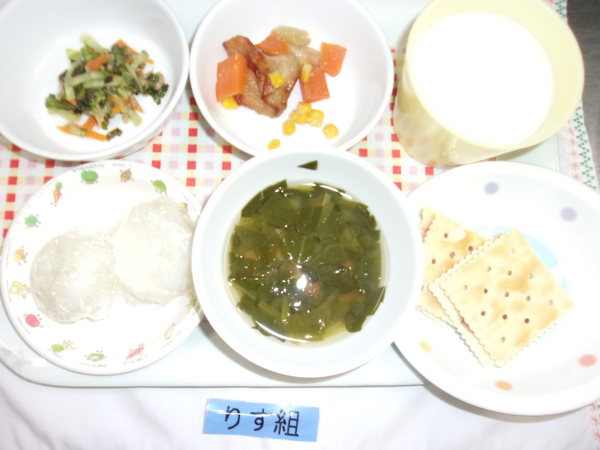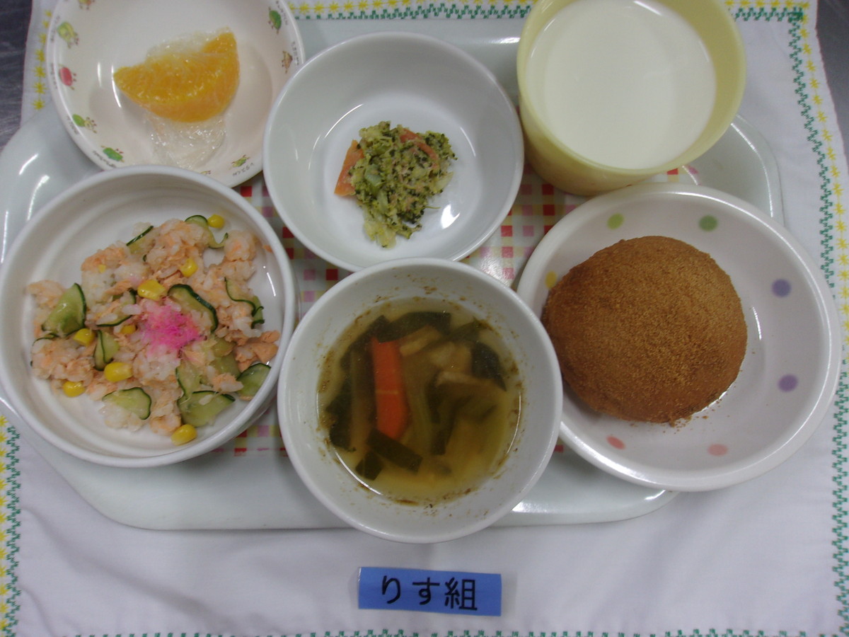 今日の給食は チキンカレーライス 人参サラダ すまし汁