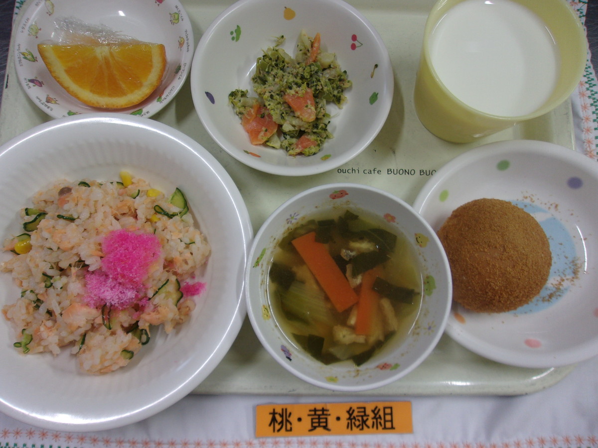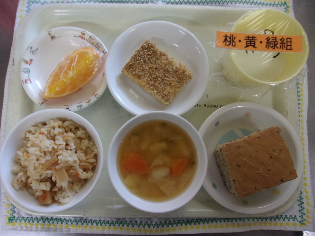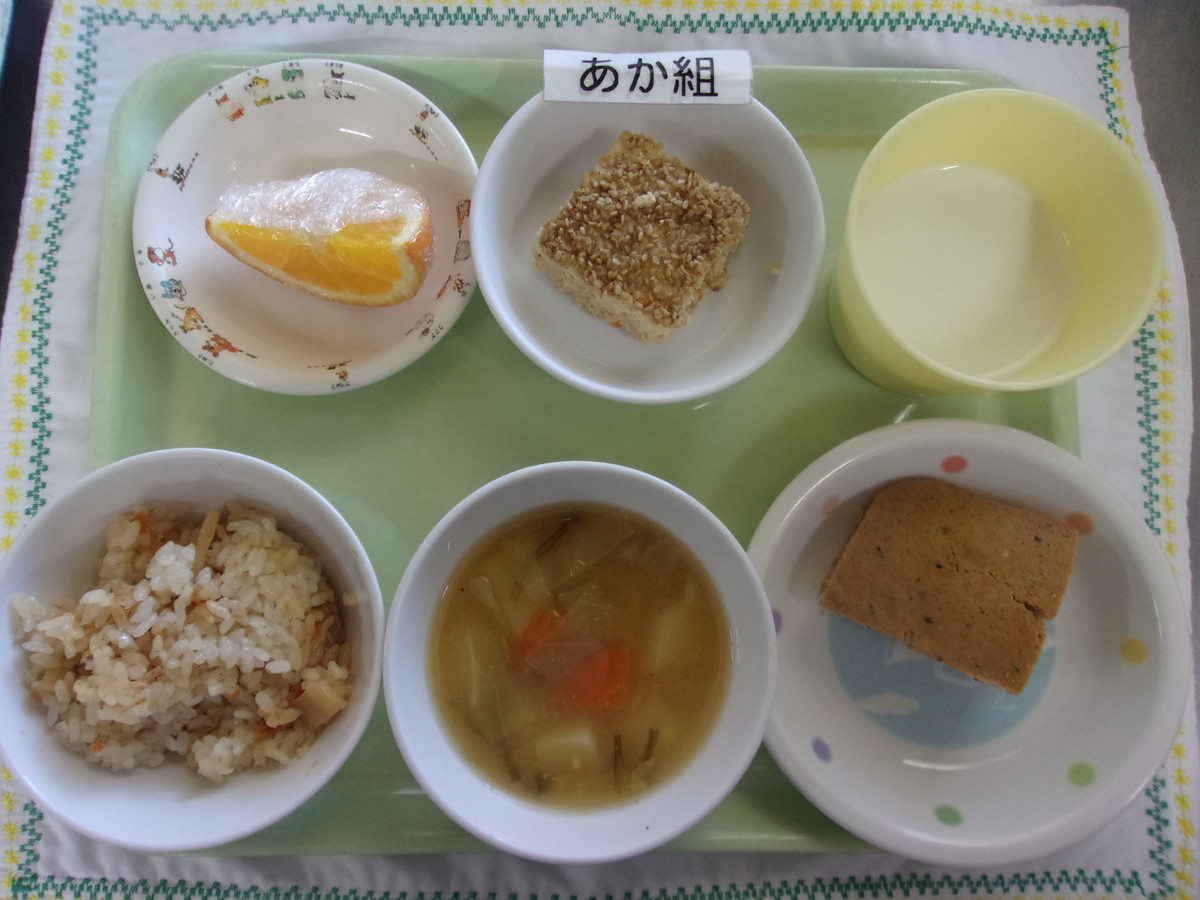 たけのこご飯 松風焼 新じゃが味噌汁 オレンジ