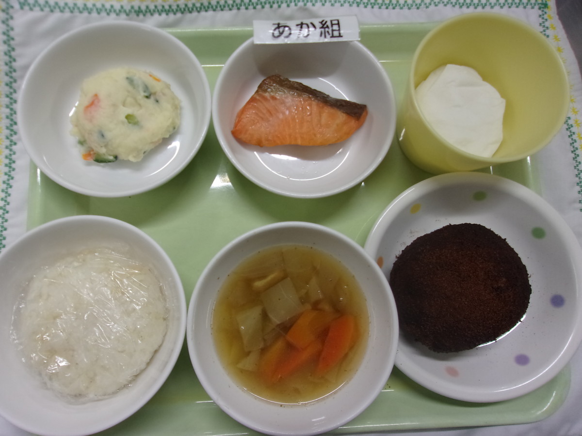 ごはん 焼き鮭 ポテトサラダ 春野菜の味噌汁 オレンジ