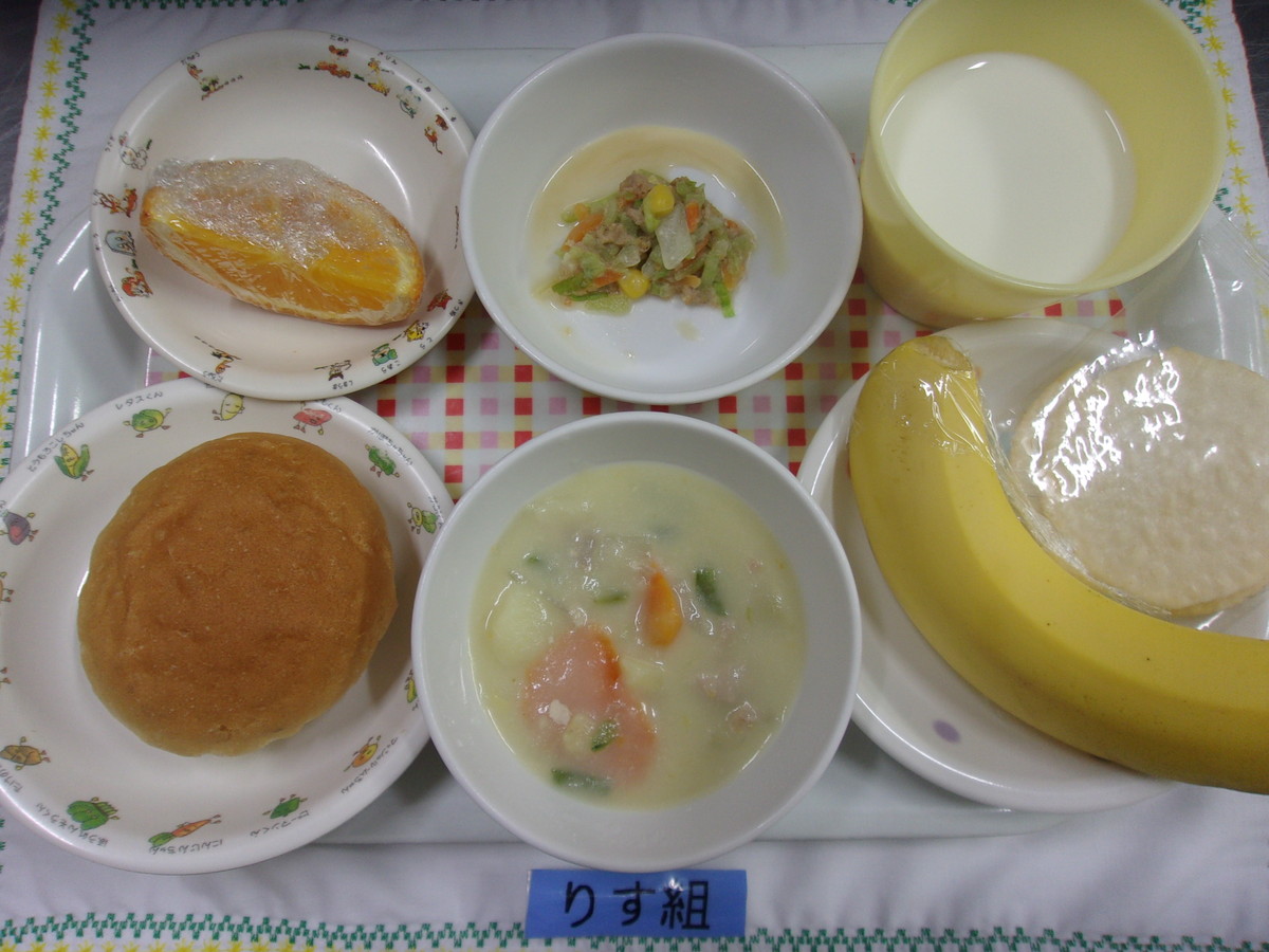 ロールパン ホワイトシチュー ミックスサラダ オレンジ