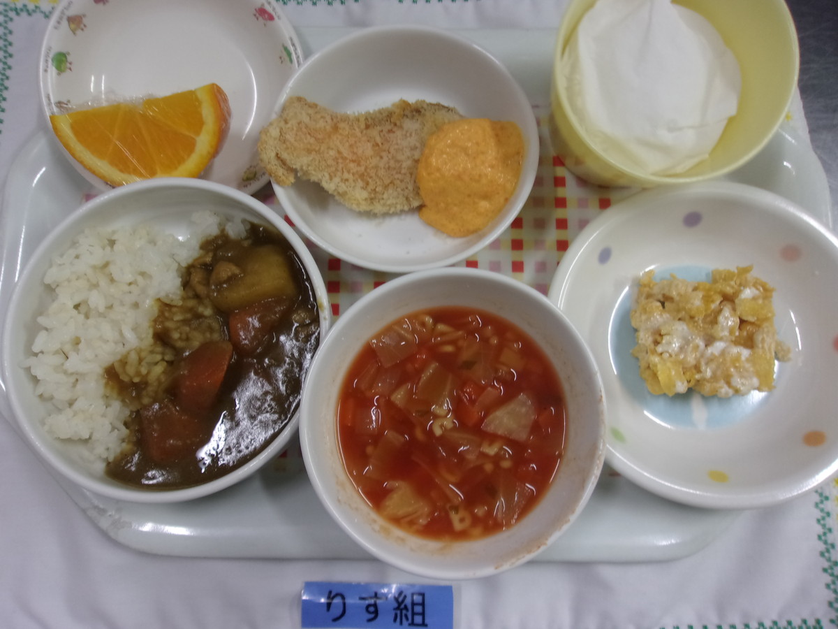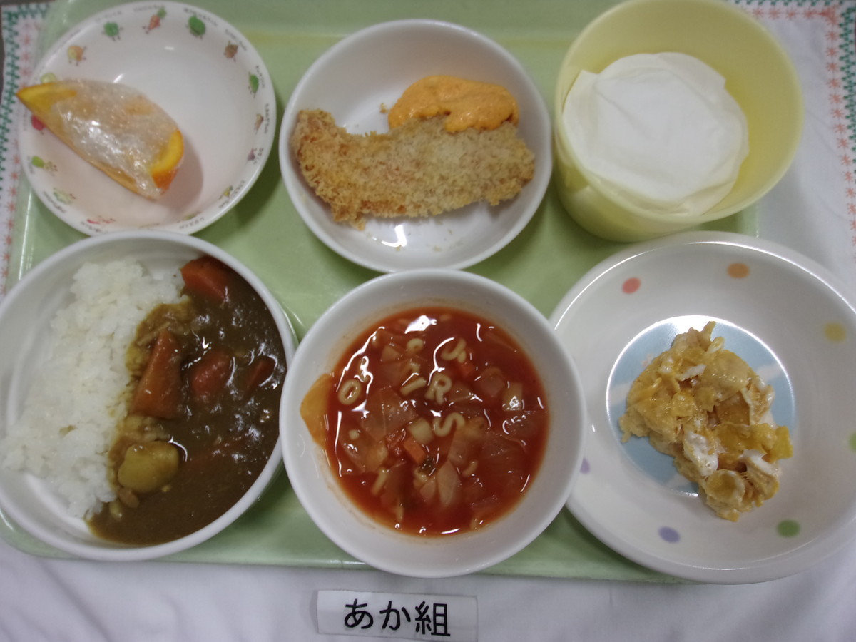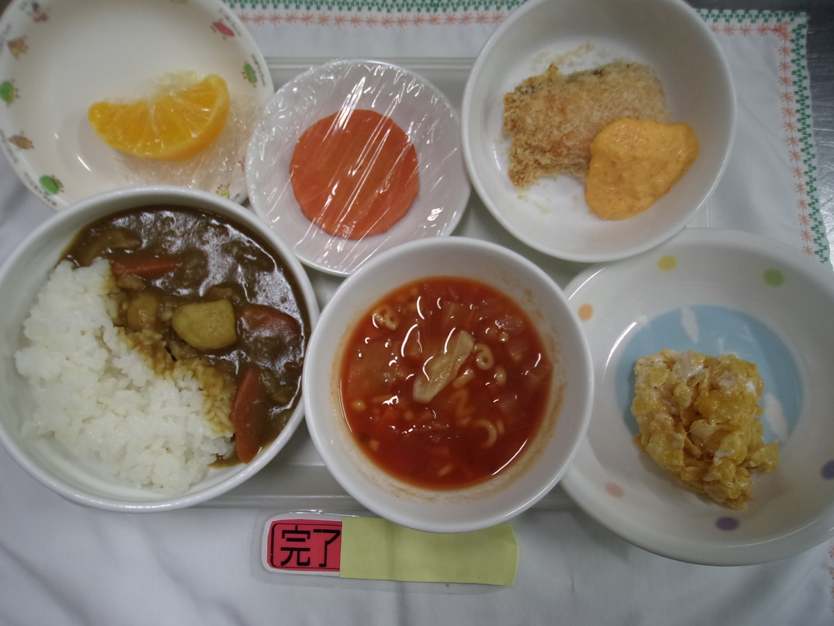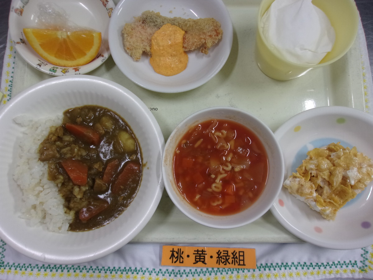チキンカレーライス 鮭フライタルタルソース ABCスープ オレンジです。
