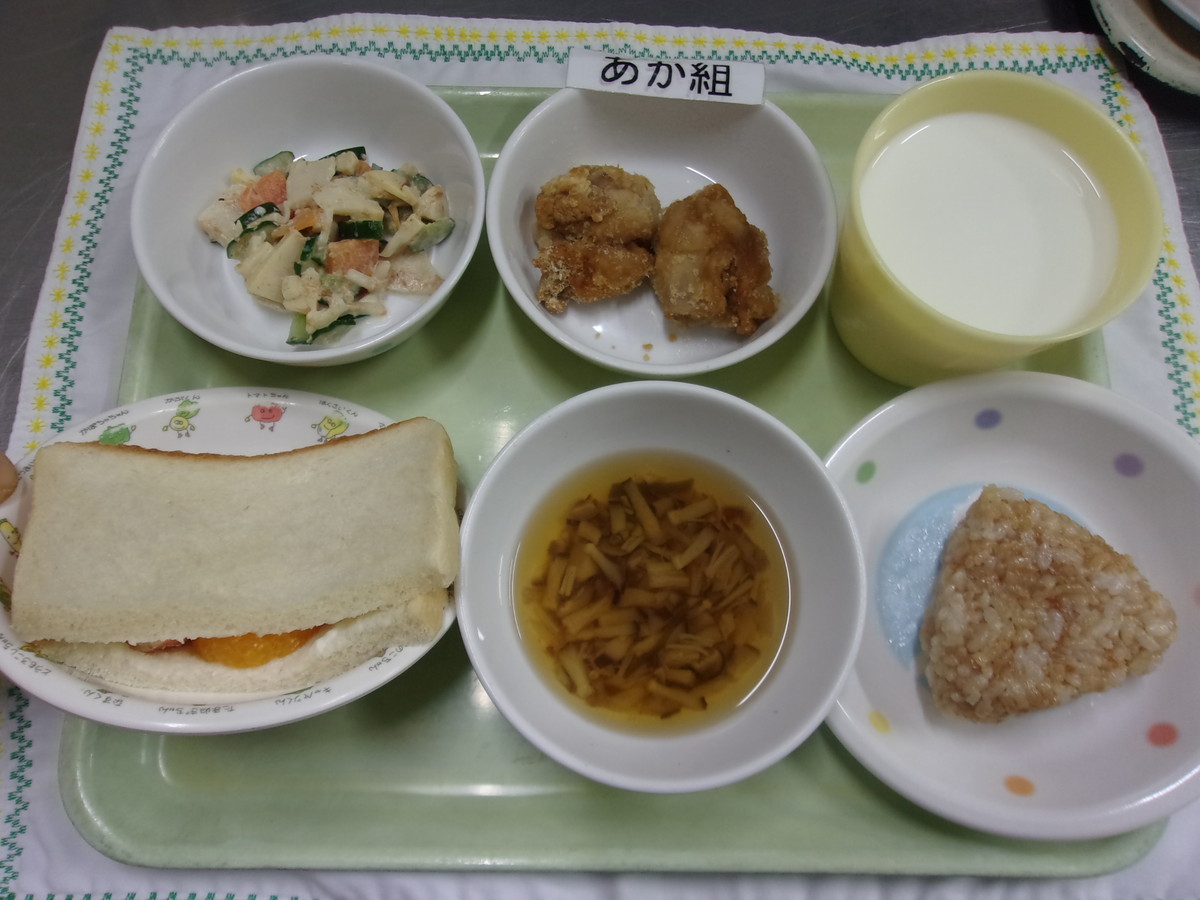 カラフルサンド から揚げ 春野菜サラダ にょきにょきスープです。
