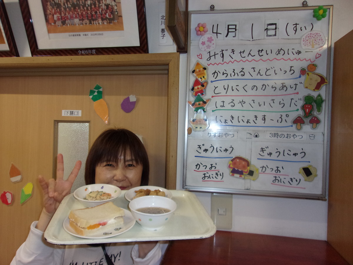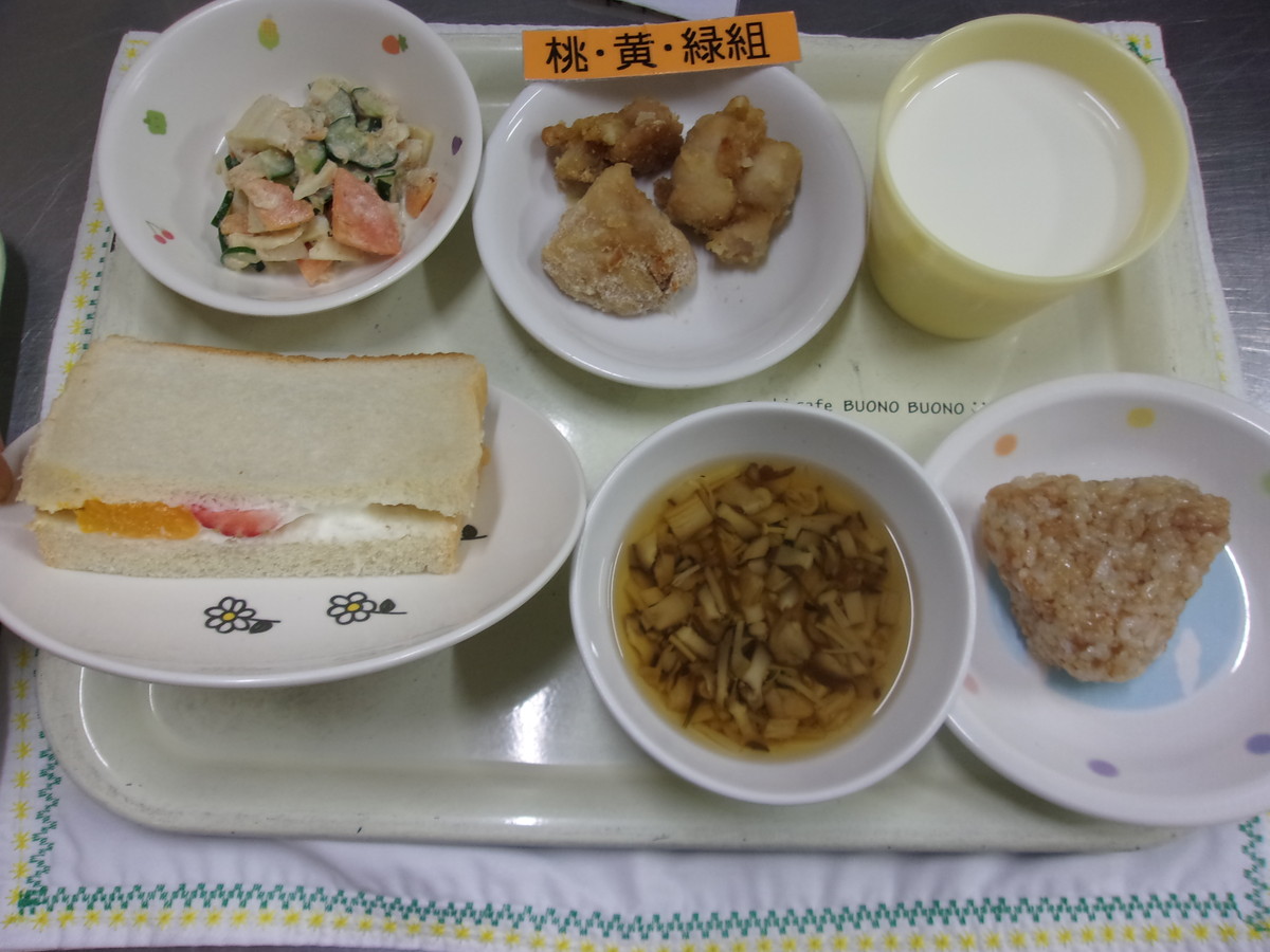 カラフルサンドはみかんといちごの生クリームサンド、春野菜サラダは筍のサラダ、にょきにょきスープはきのこのスープです。