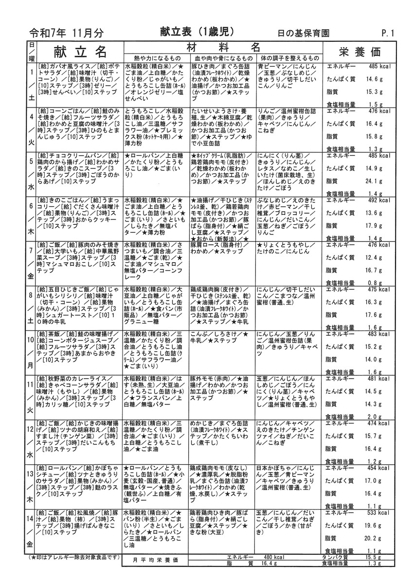 ■献立表(1歳児) PDF版は>>こちら