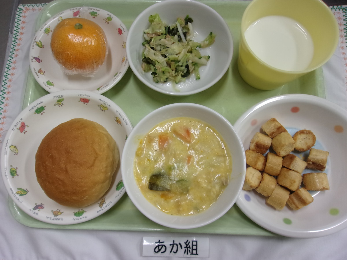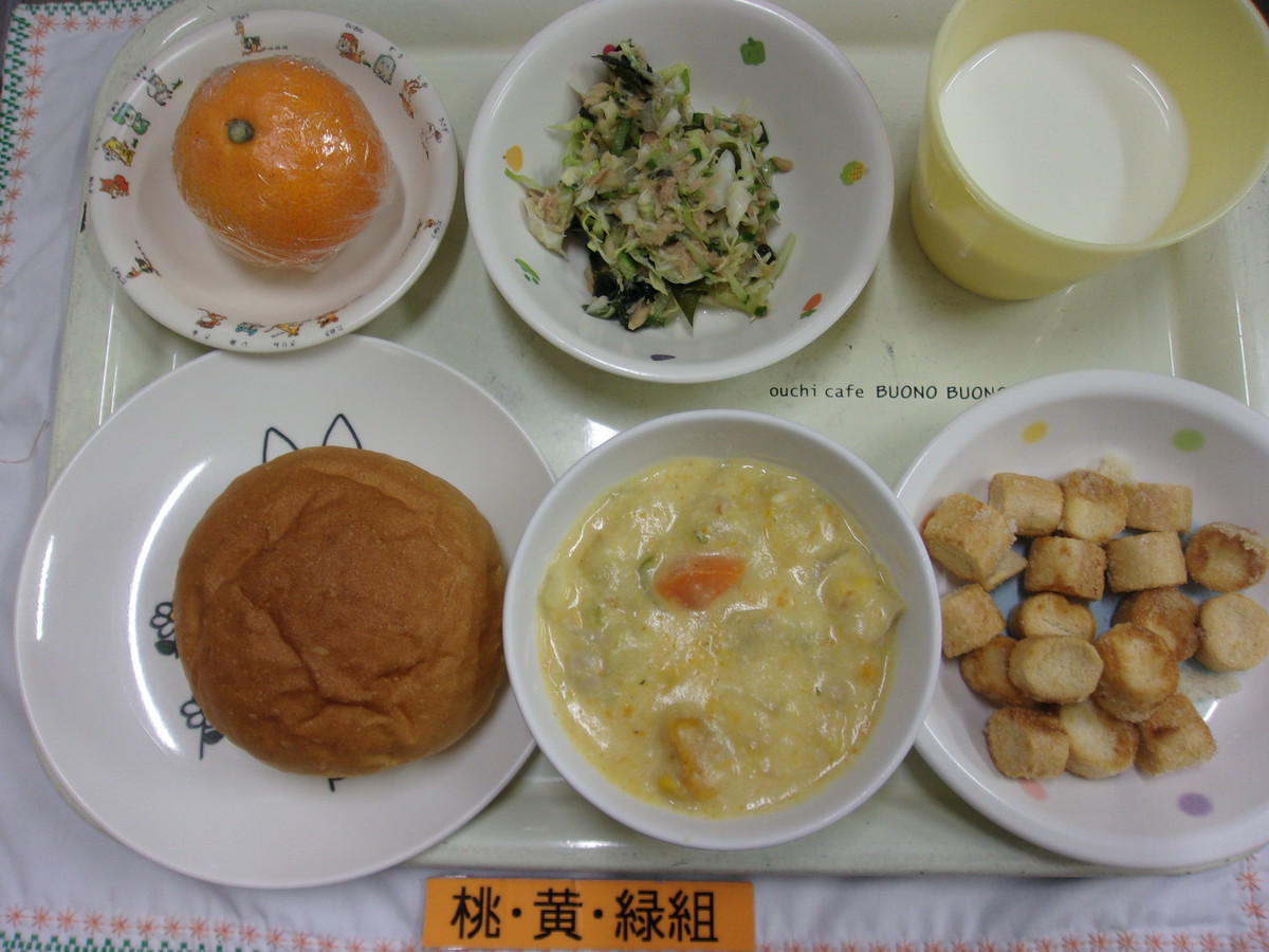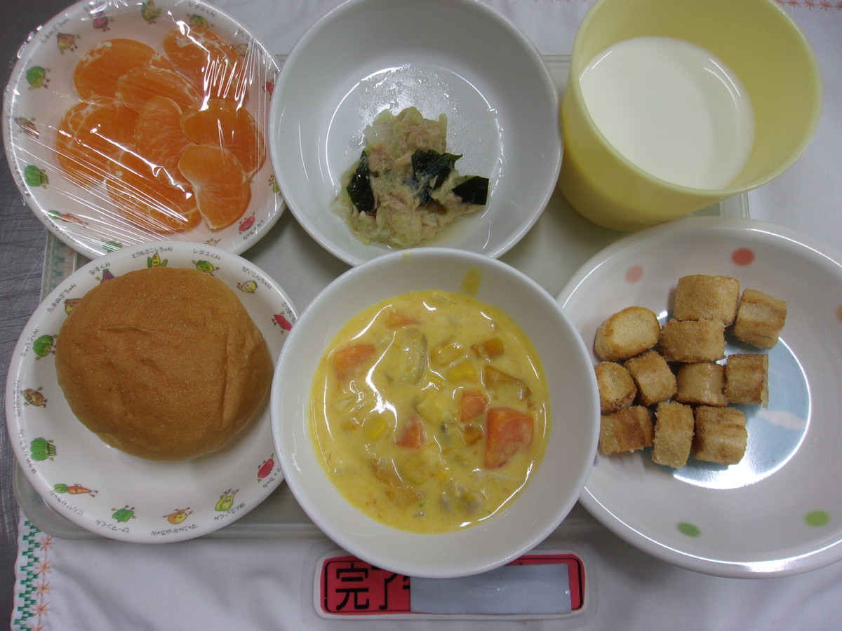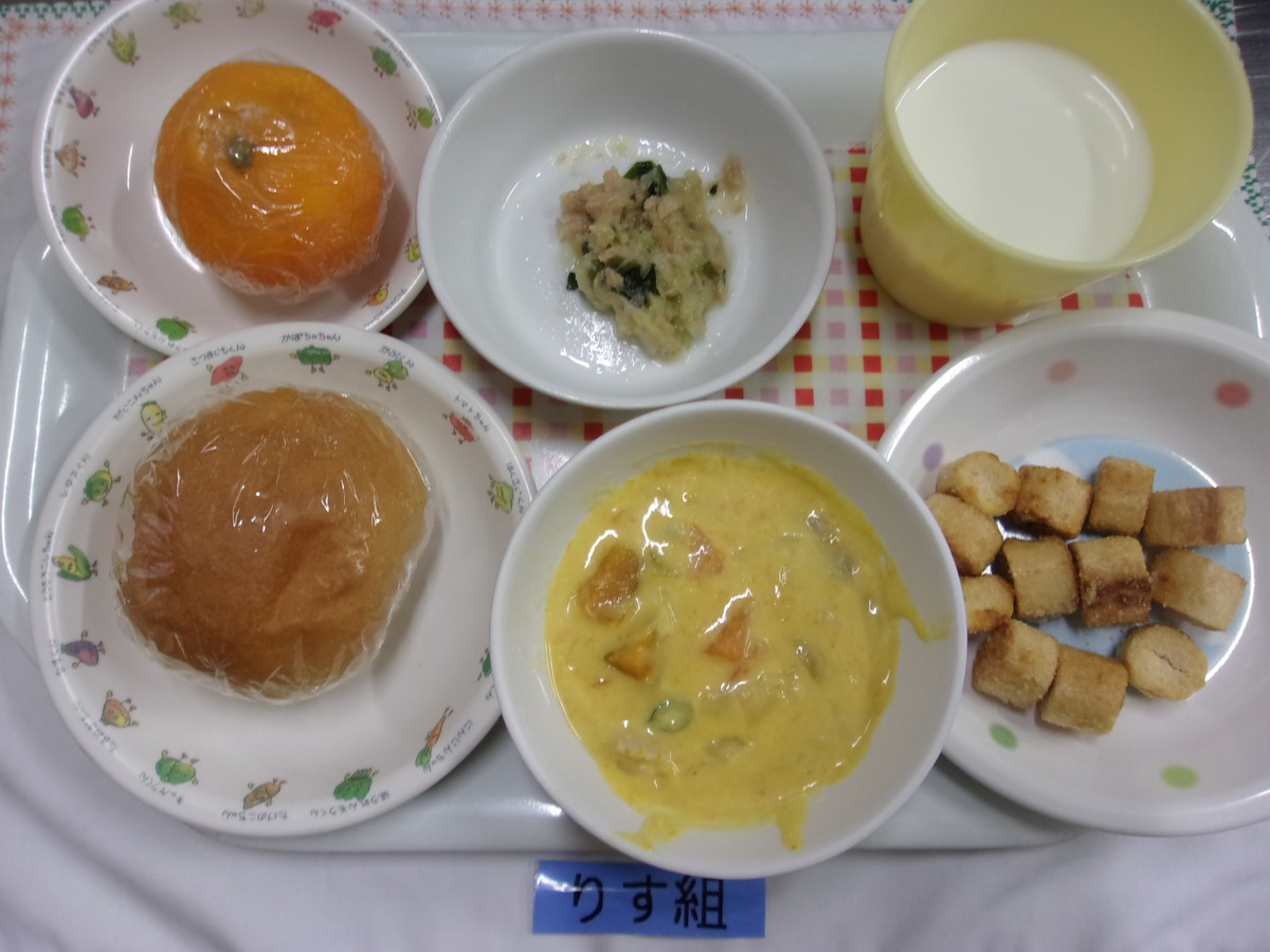 ロールパン かぼちゃのシチュー ツナときゅうりのサラダ みかん