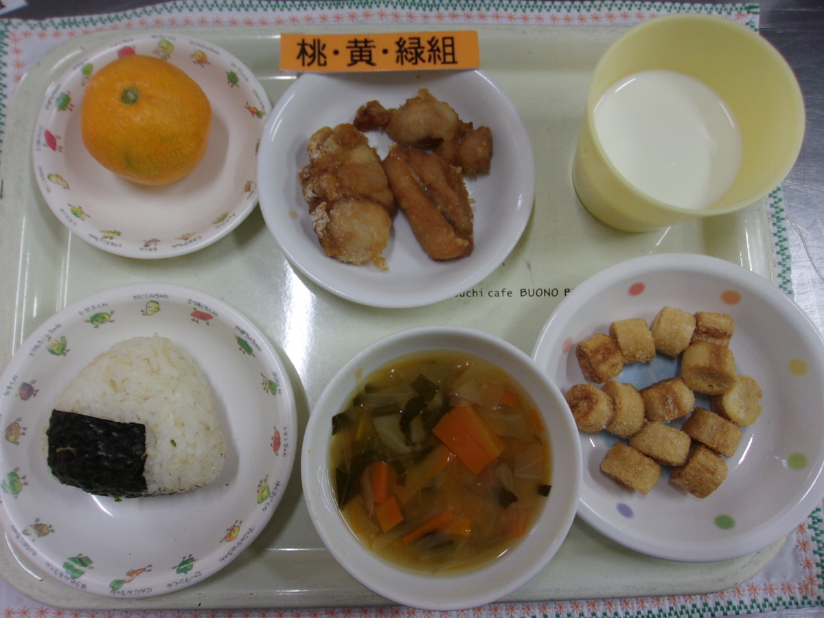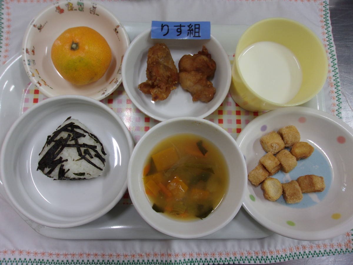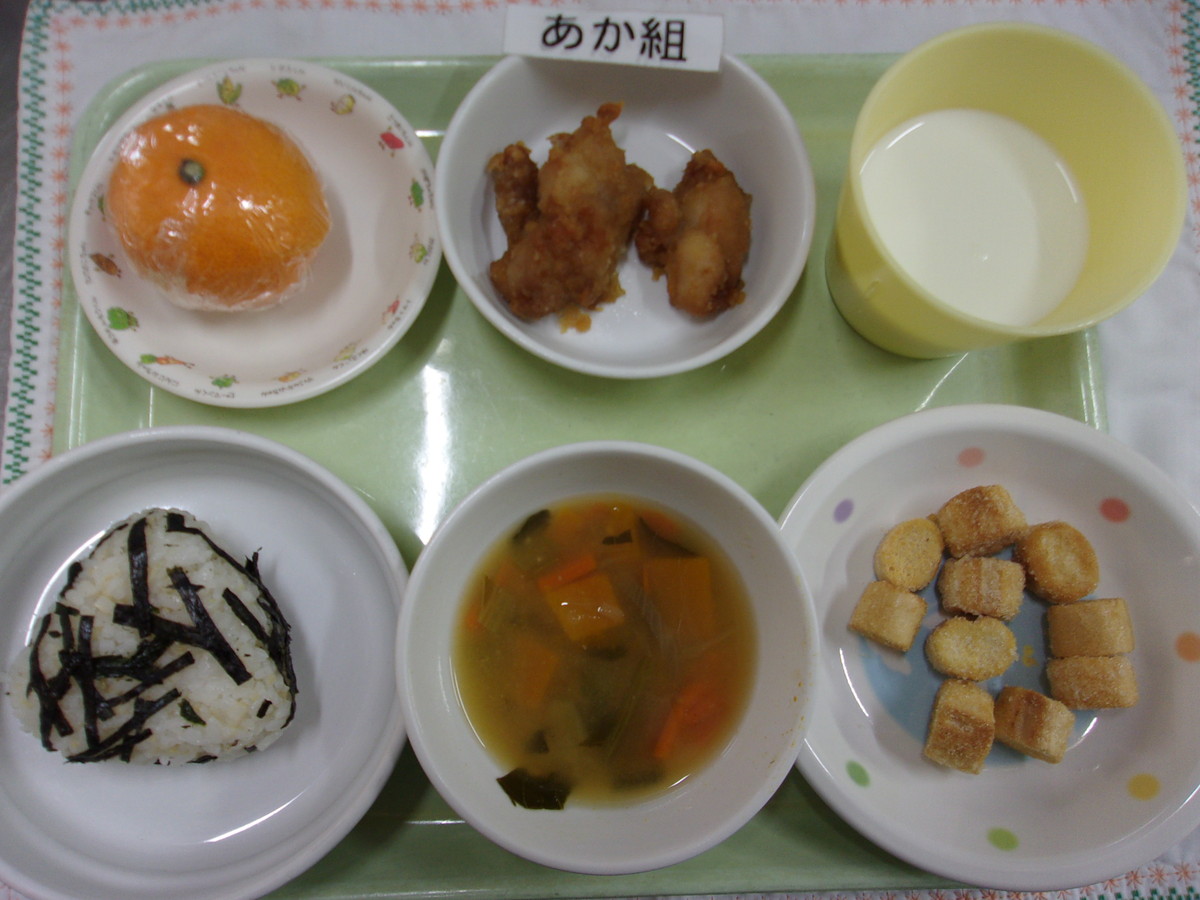 塩おにぎり とりのから揚げ 野菜味噌汁 みかんです。