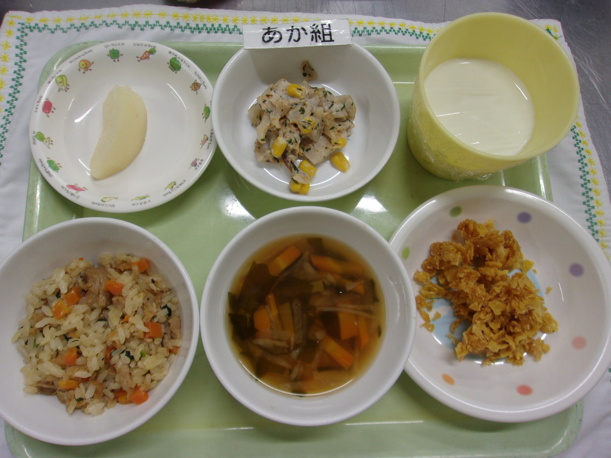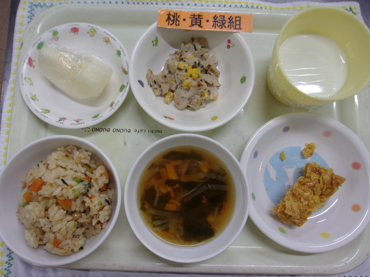 ロールパン 鶏肉コーンのオーブン焼き 大豆のサラダ コロコロスープ